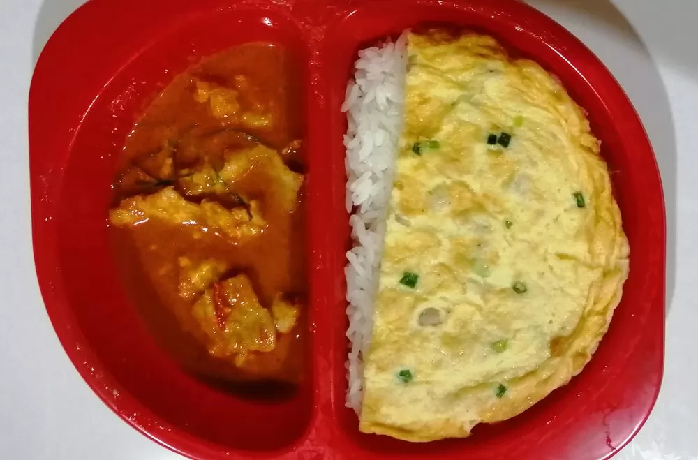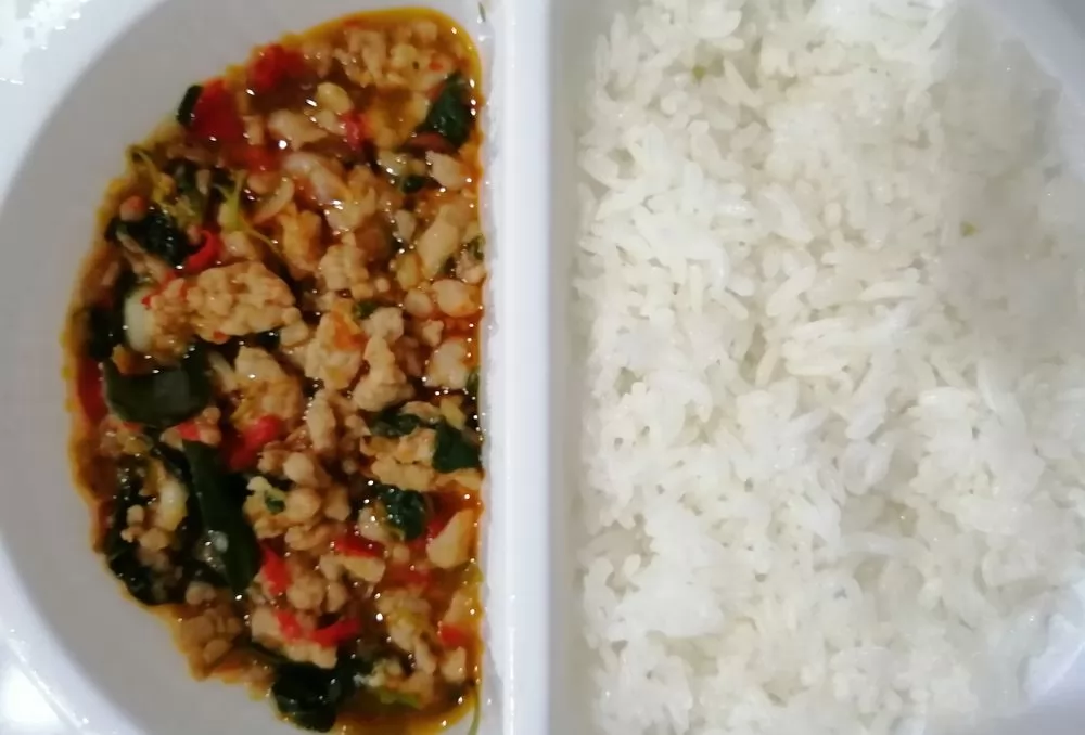 This lunch box features large pieces of minced pork, stir-fried with chopped holy basil, resulting in a spicy and salty dish with rich layers of flavor. It’s so delicious and goes perfectly with rice.