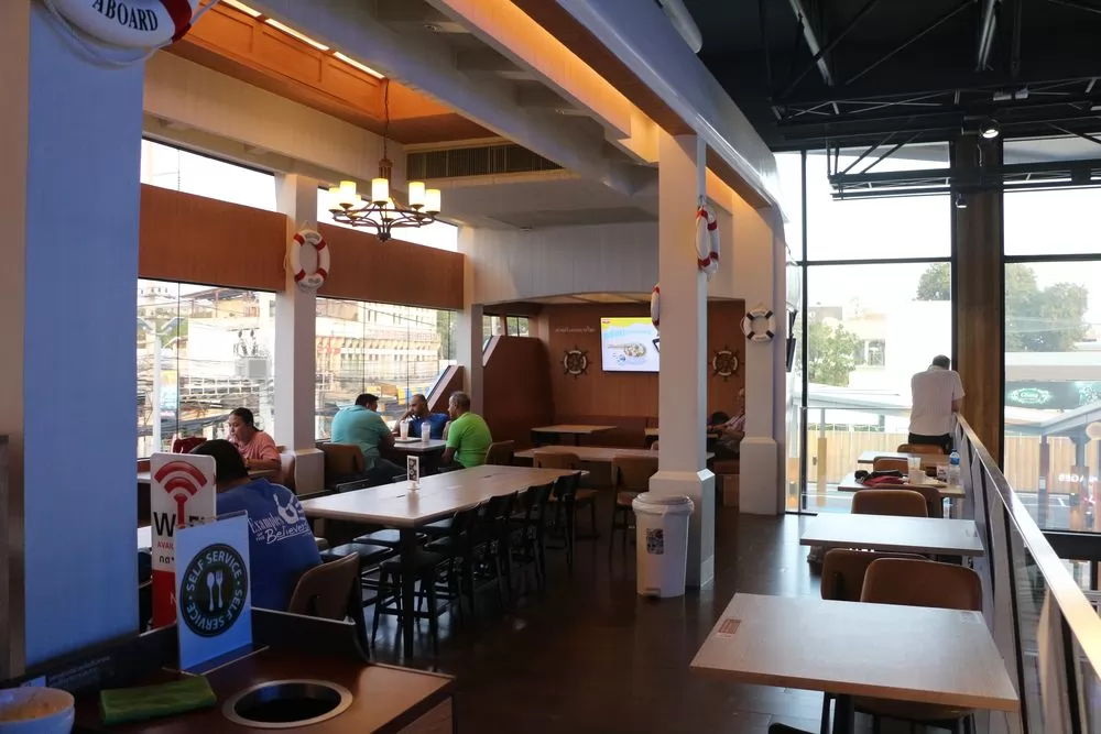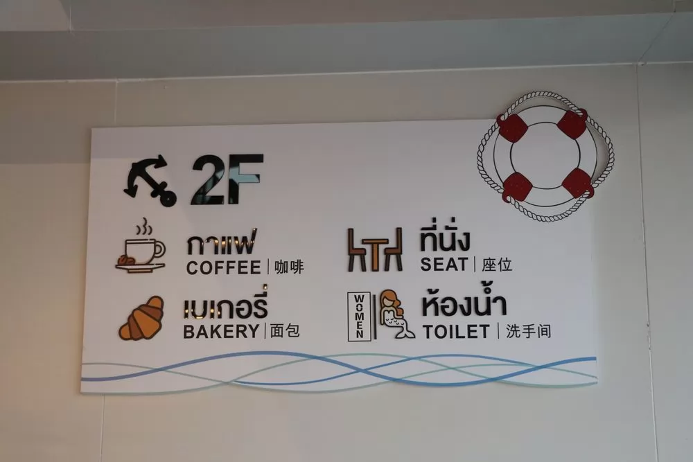 In addition to the usual convenience store, coffee shop, and bakery, there's a unique mini restaurant that offers a variety of delicious foods, from buns and sandwiches to porridge, fried rice, and various rice dishes. They offer a "Chinese, English, and Thai" menu with dishes like Japanese fried chicken rice for 69 baht, tuna salad for 59 baht, and an American ham sandwich for 55 baht. Prices are just slightly higher than street food.