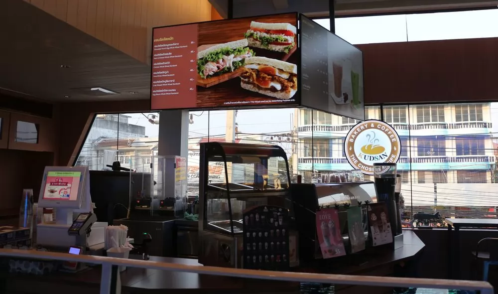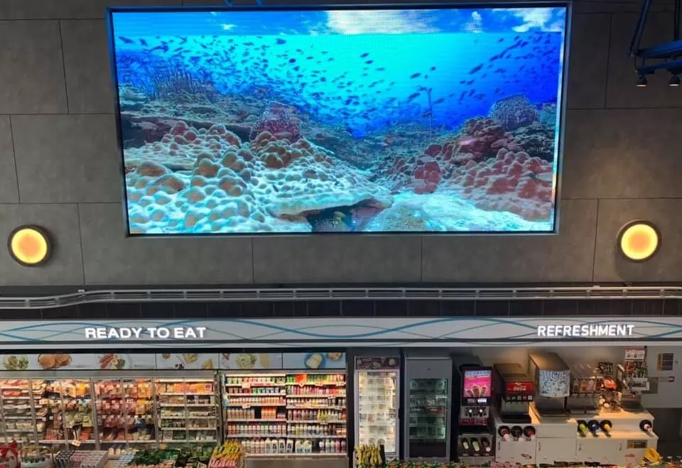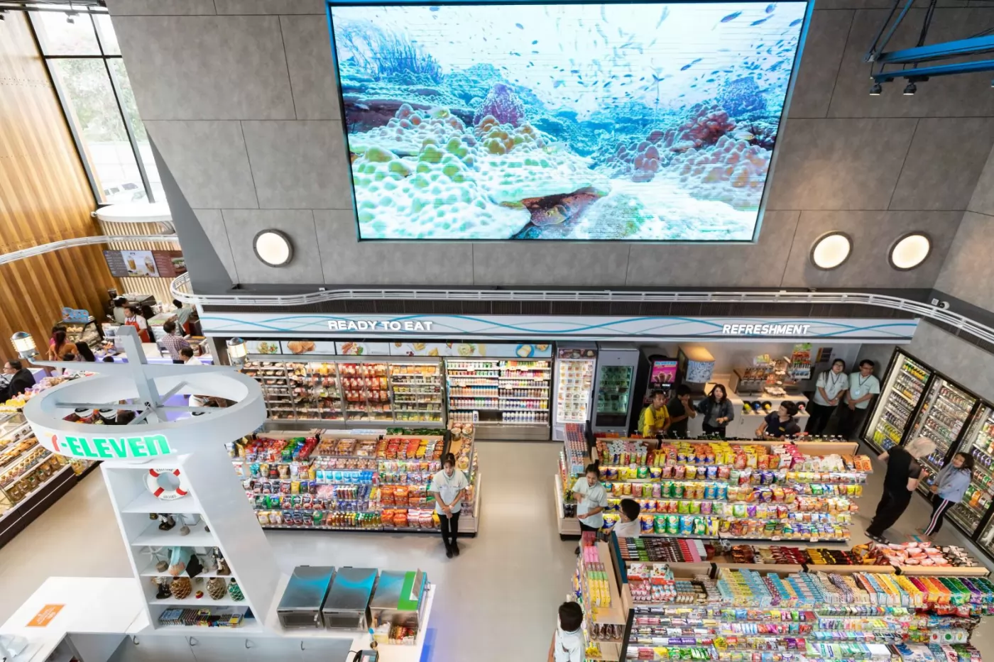 The store's design features an ocean and ship theme. Above the checkout counter, there is a 6-meter-wide LED screen continuously displaying underwater life from the Gulf of Thailand. The overall decoration and design are modern and impressive.