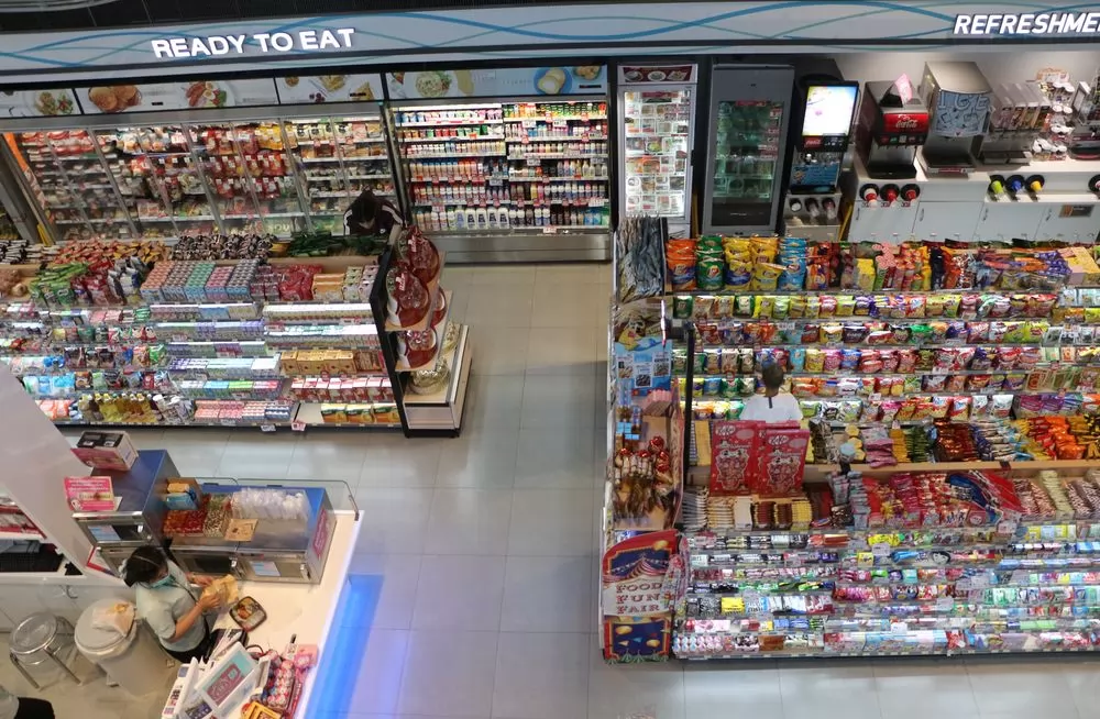 The convenience store offers a variety of snacks, colorful iced drinks, and souvenirs.