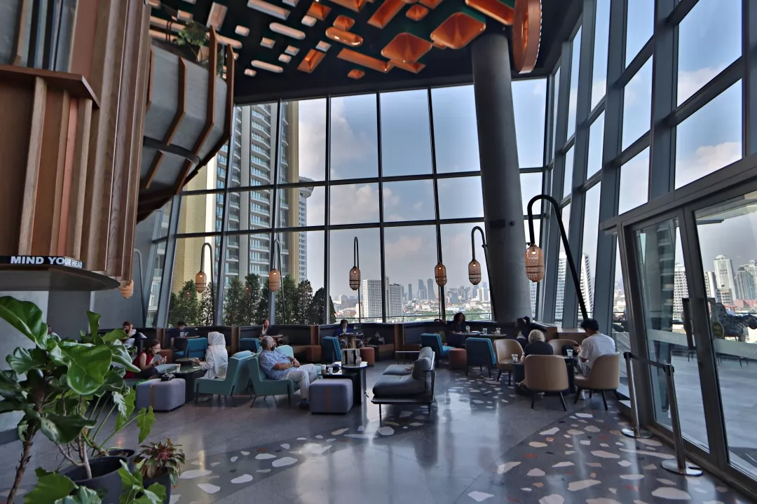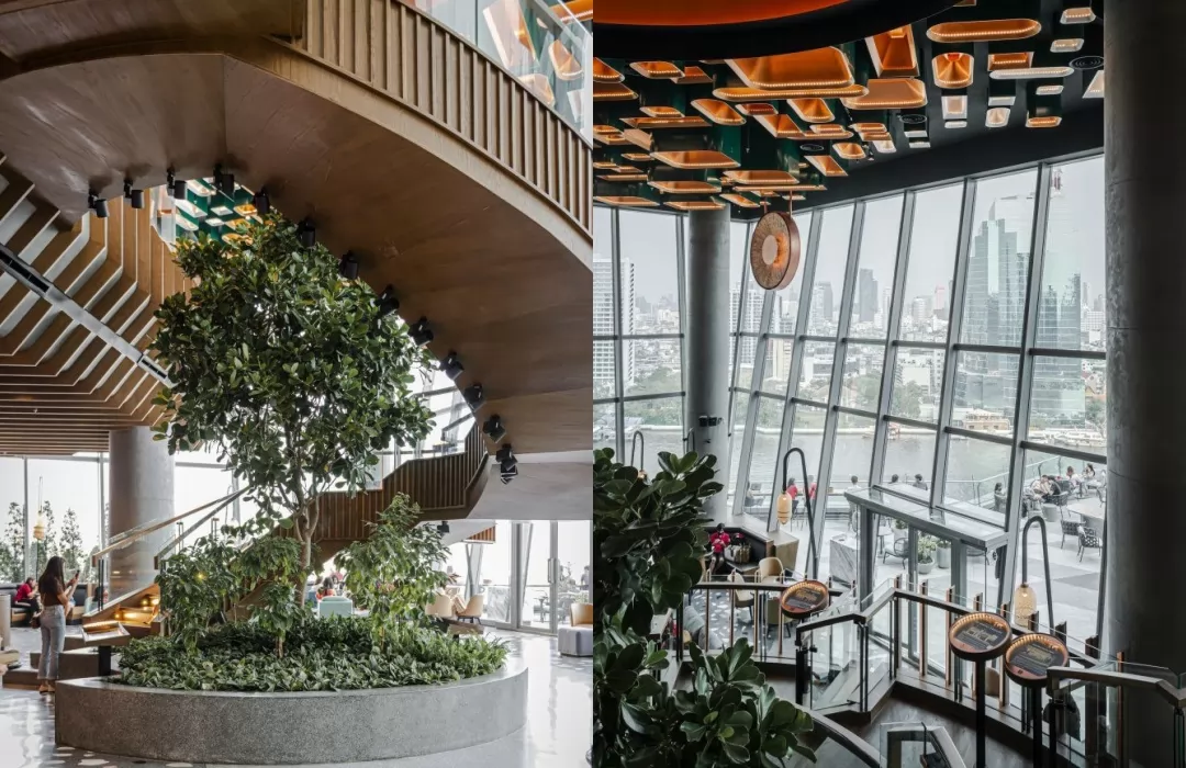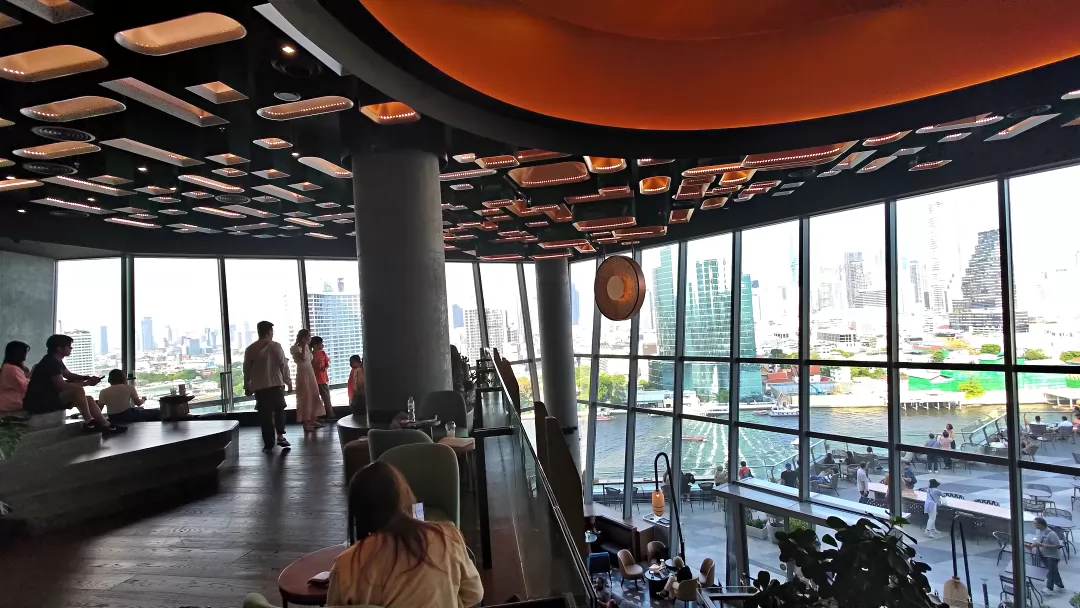 For those seeking a quiet and private space, the mezzanine offers comfortable seating corners designed in a stadium style, where you can relax in a cozy atmosphere while enjoying drinks and the panoramic view of the Chao Phraya River, adding a charming touch to the entire experience.