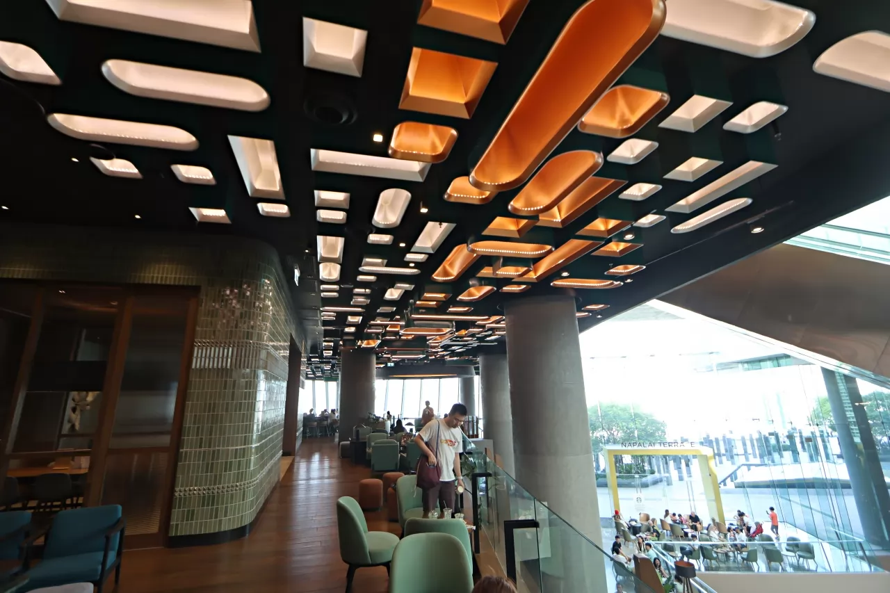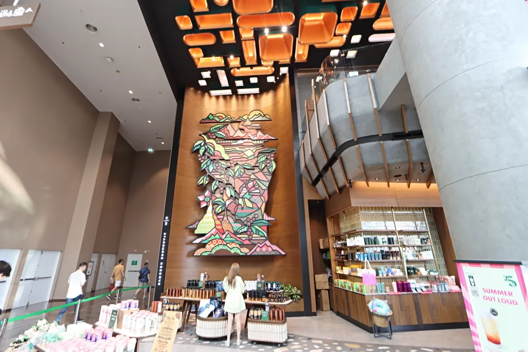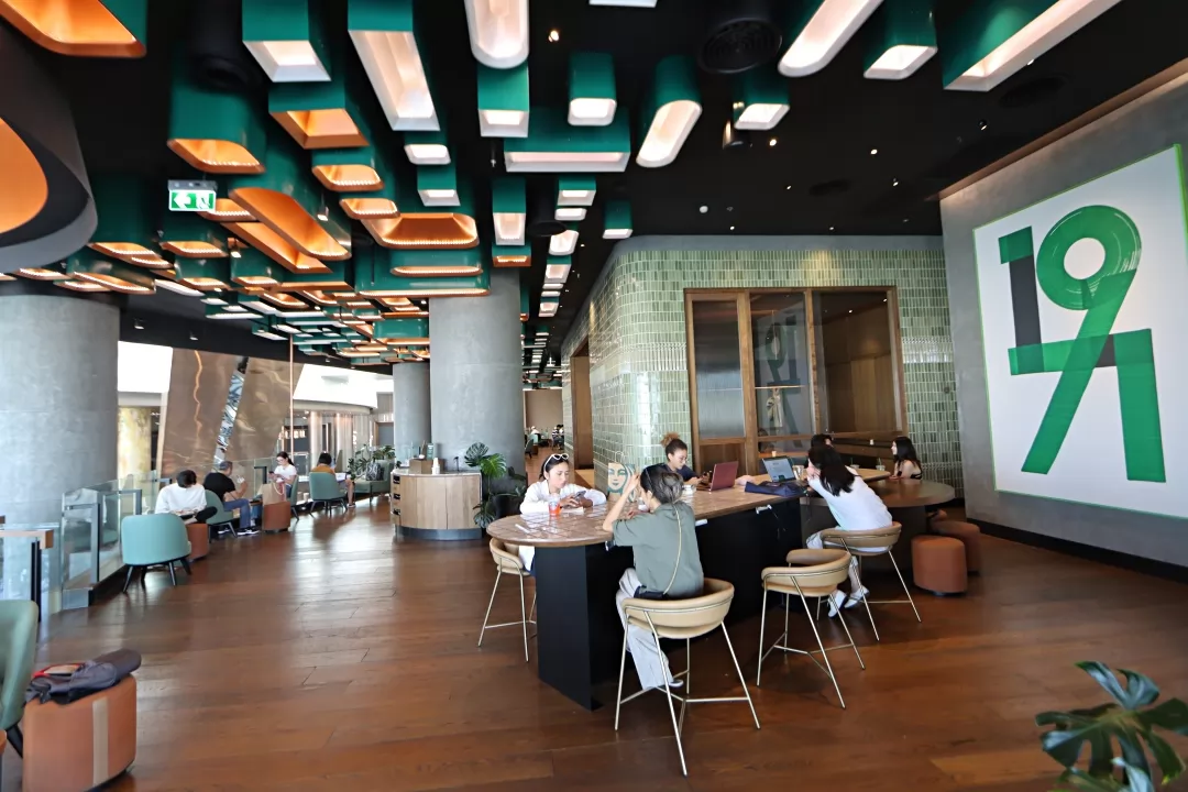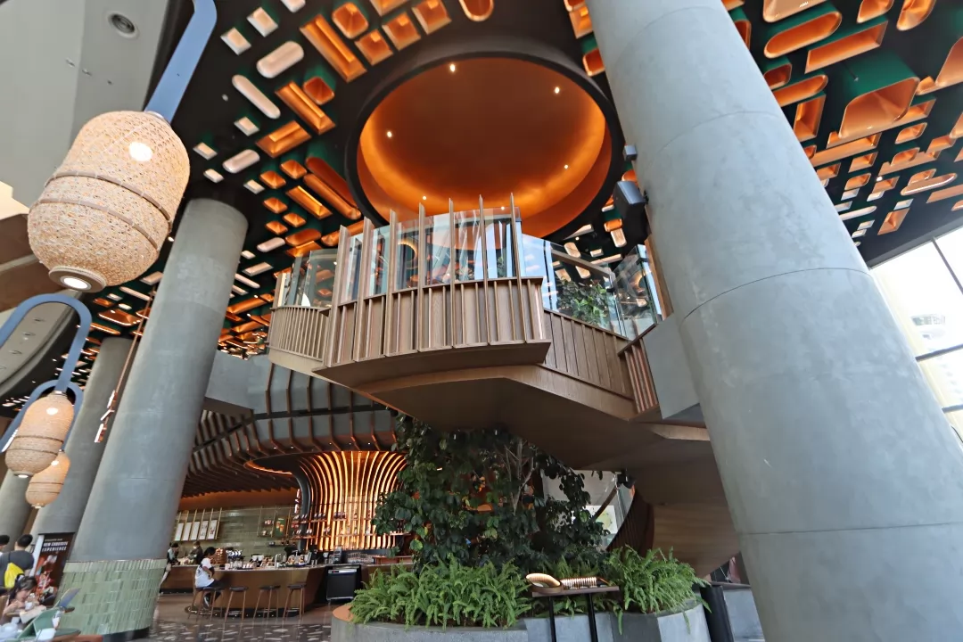 Before heading to the mezzanine, coffee trees from Northern Thailand plantations greet you with pleasant green colors. The stairs leading to the mezzanine are inspired by the coffee flavor wheel design, preparing you for a Starbucks landmark tour. Each staircase platform features information about the store and coffee farms from around the world.
