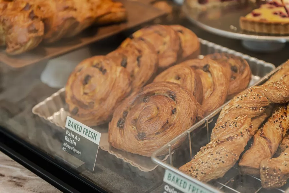 Another feature of this place is its irresistible dessert area, offering a variety of freshly baked goods daily, such as butter croissants (65 Baht), made with high-quality fresh butter from France. A bite reveals a subtle creamy fragrance, with a perfectly crispy exterior and soft interior. Additionally, try the quinoa onion and Emmental cheese twist (75 Baht), with layers of thin, crispy dough filled with béchamel sauce, onions, and Emmental cheese, offering a rich and fragrant flavor.