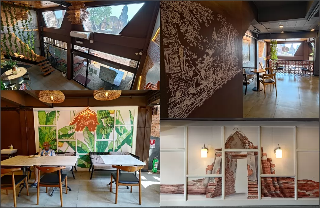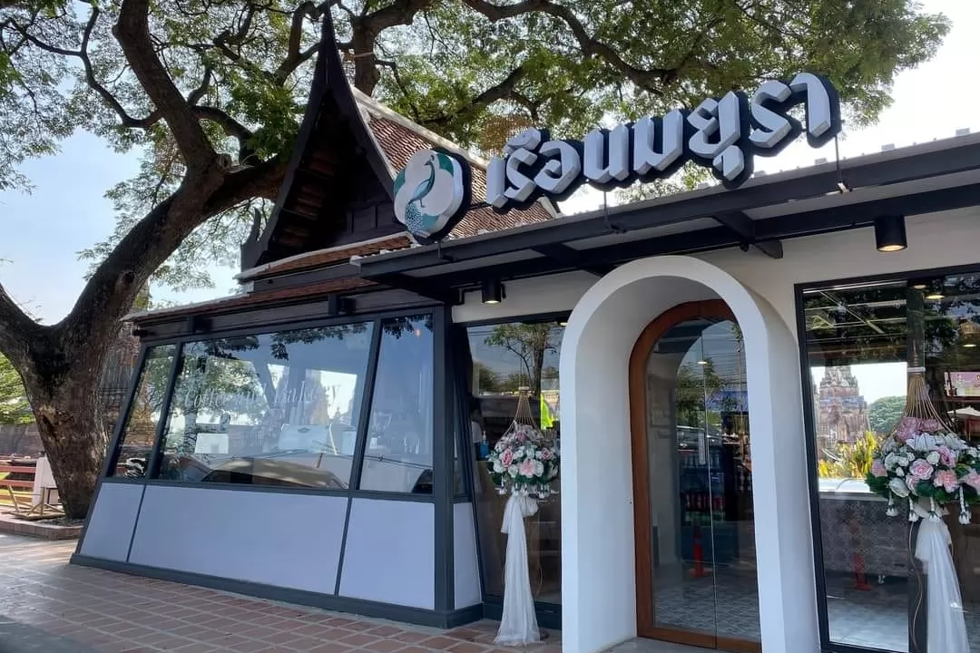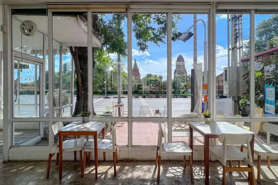 Ruean Mayura Cafe Ayutthaya (เรือนมยุรา คาเฟ่อยุธยา) is a small coffee shop located in front of Wat Chaiwatthanaram, decorated in a modern Thai style.