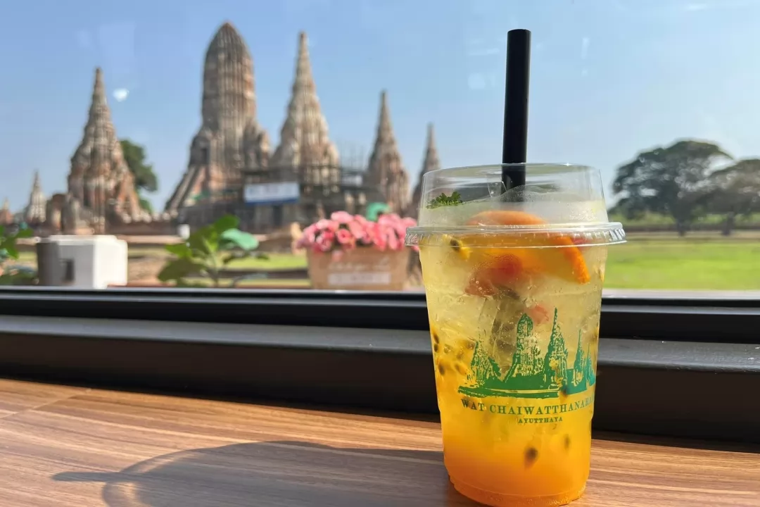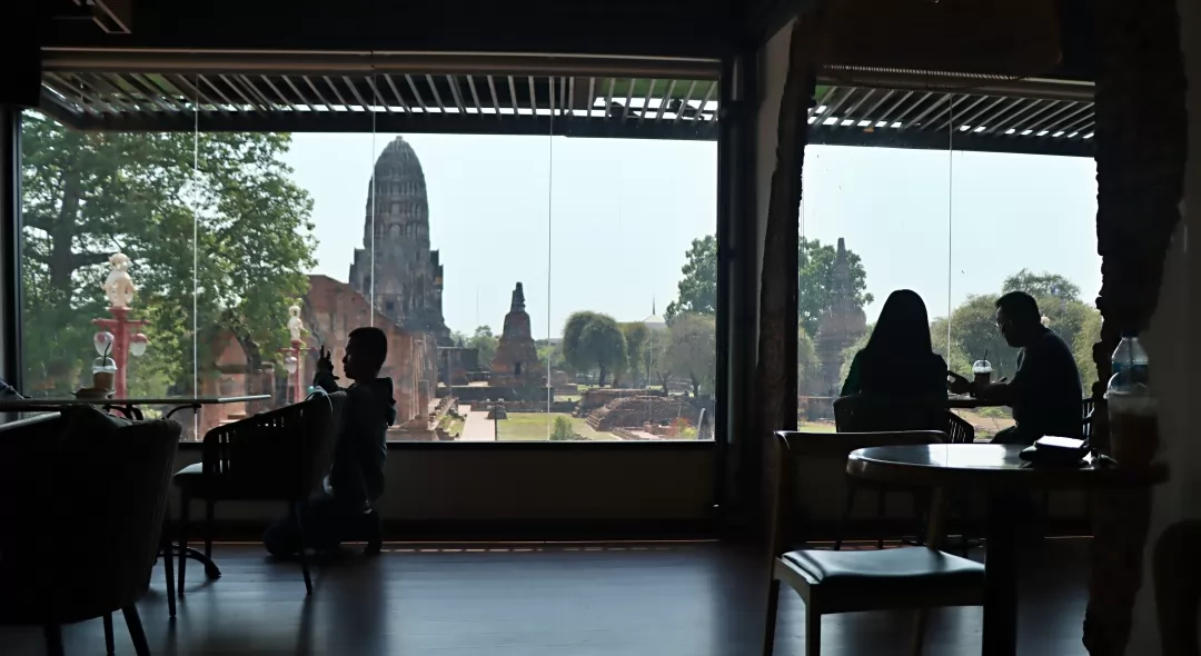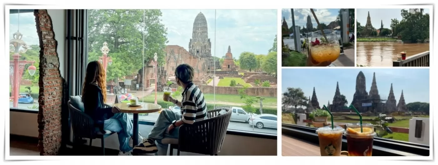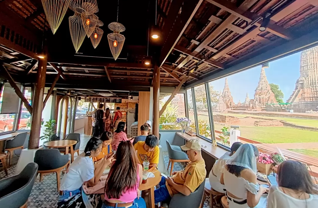 This is a coffee shop with a historical site as its highlight. You can go inside for a drink and enjoy the cool air conditioning. The café features transparent open glass windows that offer a wide view of Wat Chaiwatthanaram.