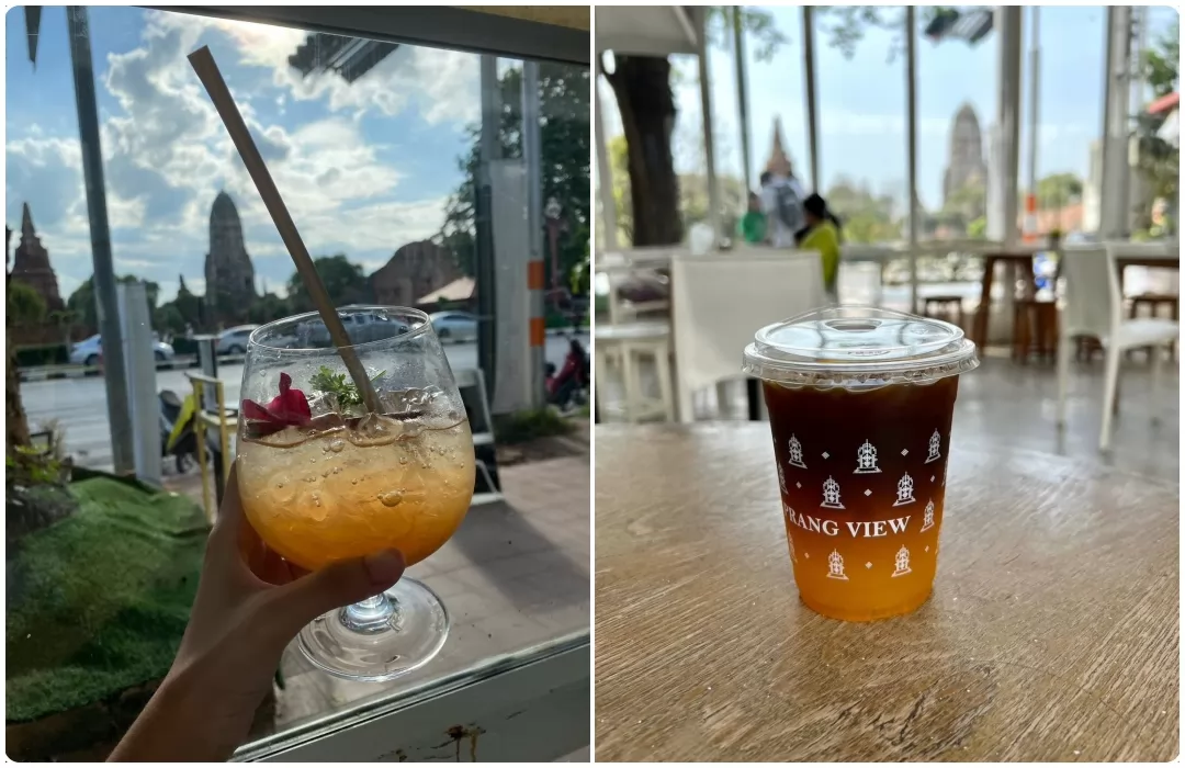 Located near Punthai Coffee, PRANG VIEW café offers even better views. On the right, you can see the main prang of Wat Ratchaburana, while on the left, you can spot the iconic Buddha head in tree roots at Wat Mahathat.