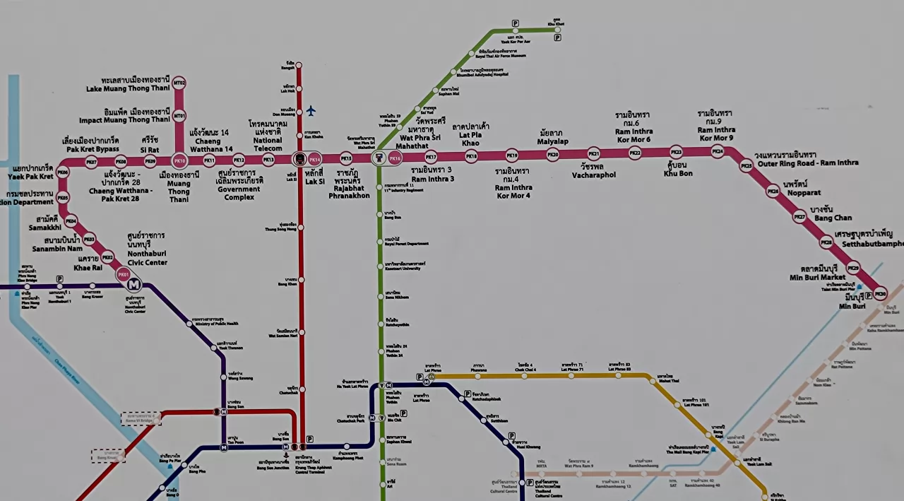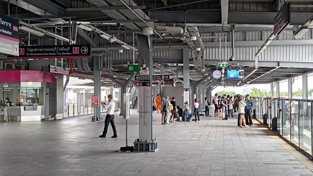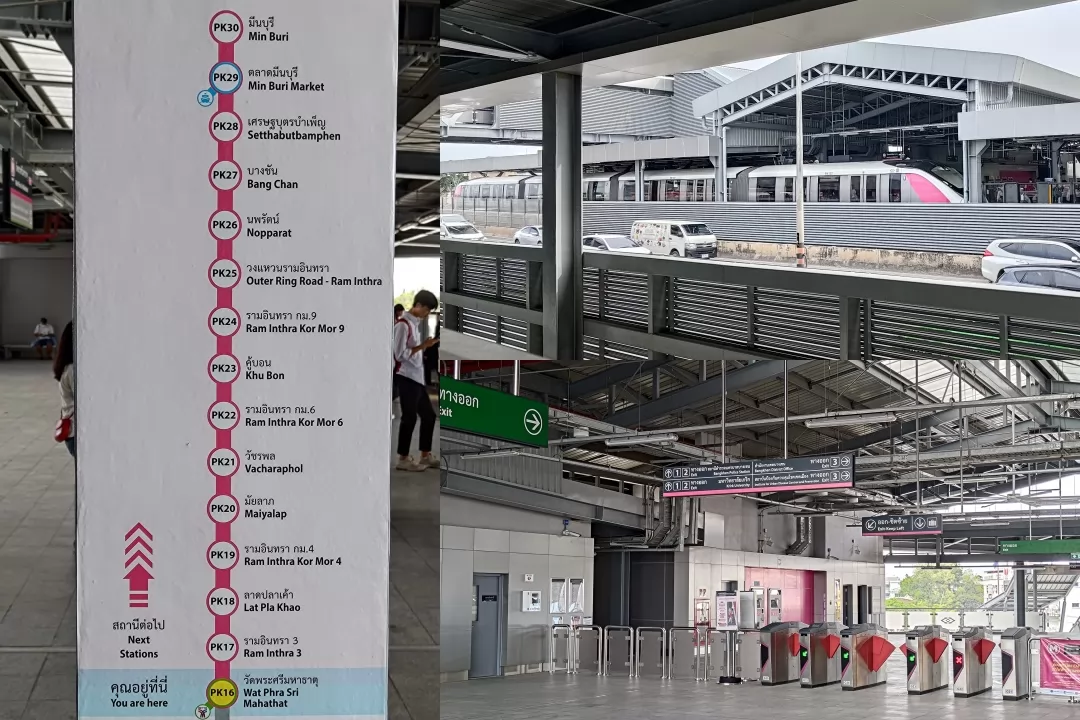 The first station, Nonthaburi Civic Center, connects to the Purple Line. At the 14th station, Lak Si, it links to the Red Line towards Rangsit. At the 16th station, Wat Phra Sri Mahathat, it connects to the BTS Green Line, making it easy for passengers from these three lines to transfer to the final station, Min Buri.
