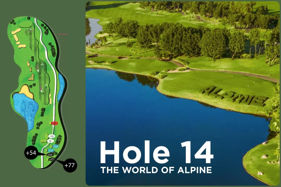 Hole 14, called "The World of Alpine," is a par-5 with a dramatic tee shot that offers a clear view of the entire hole. If you're lucky and the wind is in your favor, there’s a chance to birdie. However, the fairway is narrow and lined with bunkers, so accuracy off the tee is crucial. The second shot might reach the green, but beware of the trap behind the green, which could cost you several strokes.