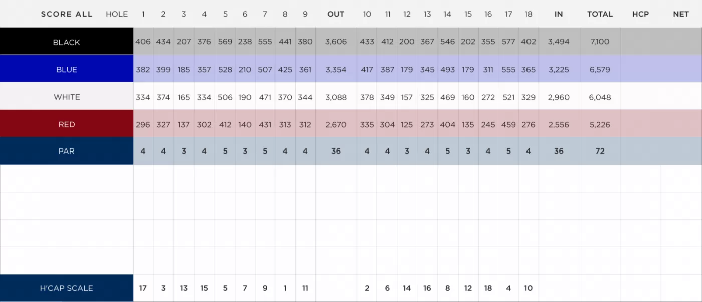 Course Length: Black Tee 7100 yards, Blue Tee 6579 yards, White Tee 6048 yards, Red Tee 5226 yards.
