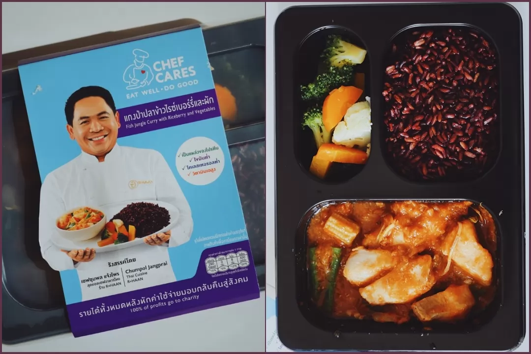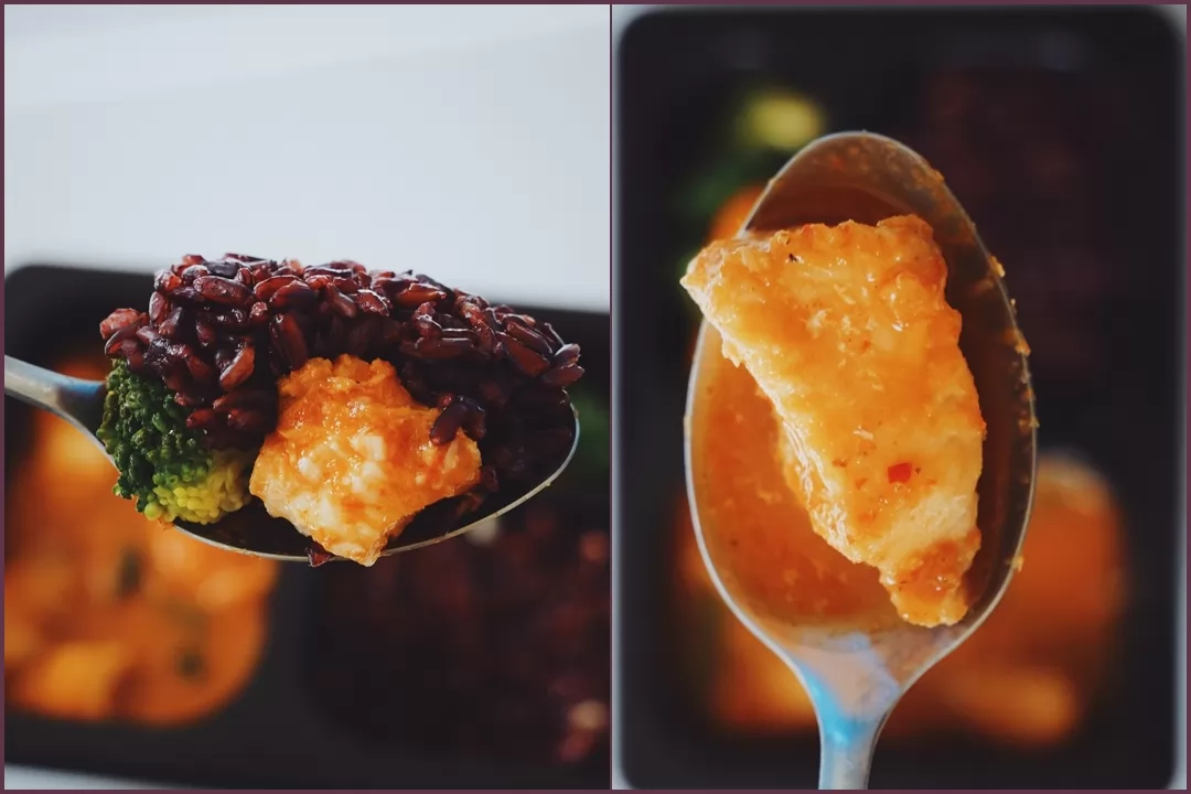 The red curry has an authentic Thai spiciness and a fragrant sauce, combined with soft, delicious catfish. The dish is served with authentic purple rice and steamed vegetables, packed neatly in a small container. It’s rich in nutrition, flavorful, and definitely healthy.