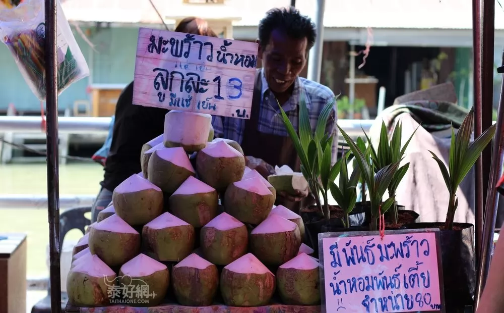 The weather is too hot! Before exploring the floating market, cool off with some coconut water. Here, green coconuts cost only 13-20 THB per piece—such a bargain! In Bangkok’s tourist areas, a single coconut starts at 40 THB, but here, you can get two for that price. If you want to enjoy the coconut juice, the vendor will cut it open and insert a straw. The moment you take a sip, a refreshing coolness flows down your throat, bringing relief from the heat—so satisfying! Moreover, Amphawa’s coconut water has a delicate fragrance and a mildly sweet taste, making it even more enjoyable.