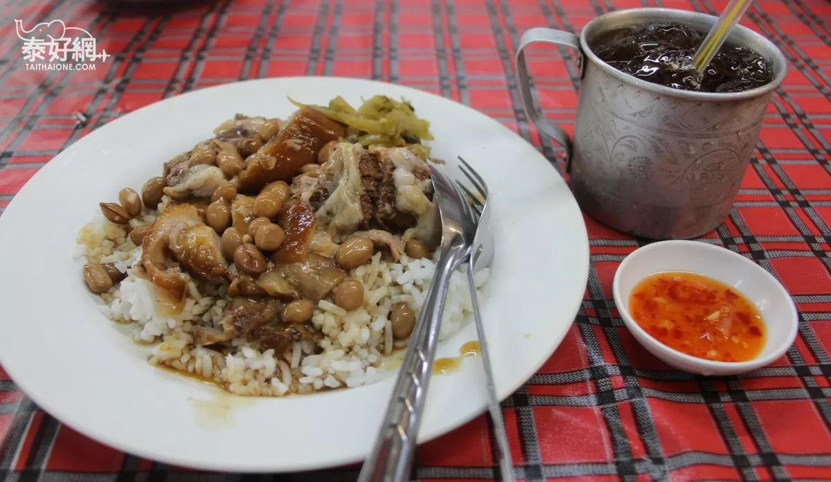 因為是路邊攤位,沒有冷氣和電風扇,吃起豬腳飯,說真的,豬腳皮的油膩、已經吃不出味道的豬肉,有了花生的綜合(融合),就不一樣,好吃!普通一盤45銖+2銖的冰茶,如果帶走則是50銖。【更多。。】