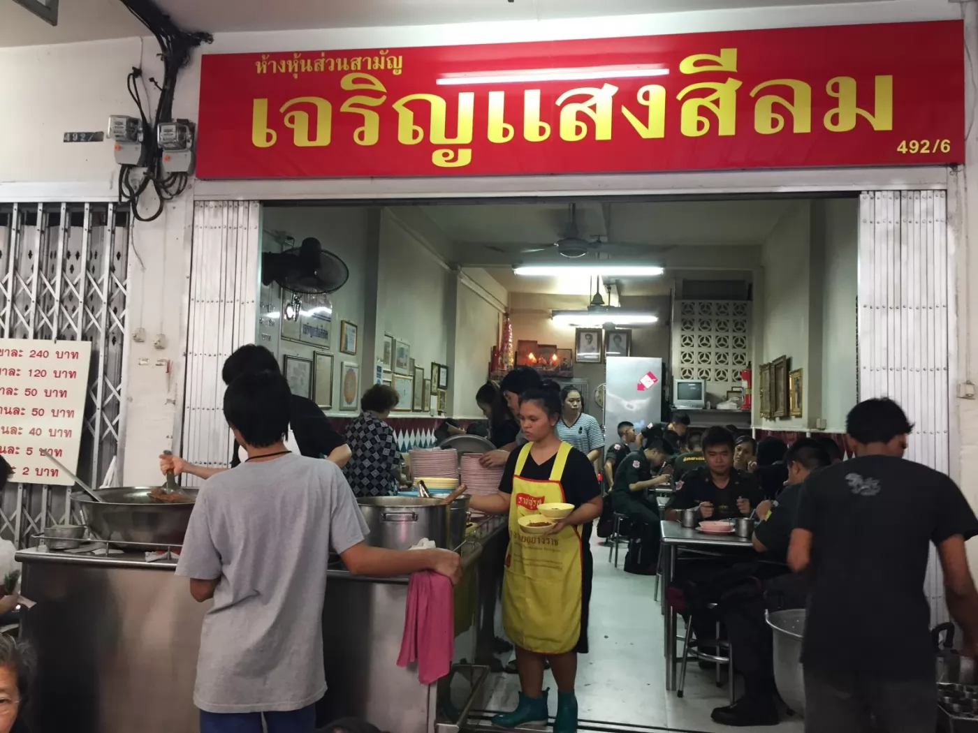 Charoen Sang Silom(เจริญแสงสีลม)位於西隆路上,State Tower的對面巷子裡,專賣泰式豬腳飯,超過50年的老字號,質樸美味,在曼谷非常出名。