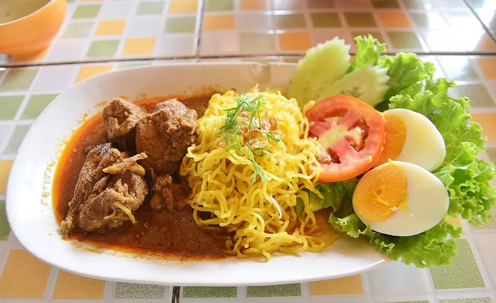 如果不喜歡吃辣,可以點咖哩乾麵(咖哩豬肉、乾麵、1顆水煮蛋、蕃茄、黃瓜以及生菜等),有別於有湯的考摔咖哩麵,1碗55銖。