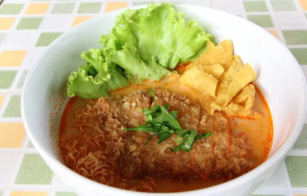 簡單一點,可以選擇「炸豬排泡麵(粿條)」,有1大塊切片的香酥炸豬排、兩片炸餃皮以及生菜,加上泡麵條,酸辣湯底,辣度可以選擇,最辣真的是會讓不吃辣的朋友抓狂,不信可以來挑戰看看,價格不貴,1碗才55銖。