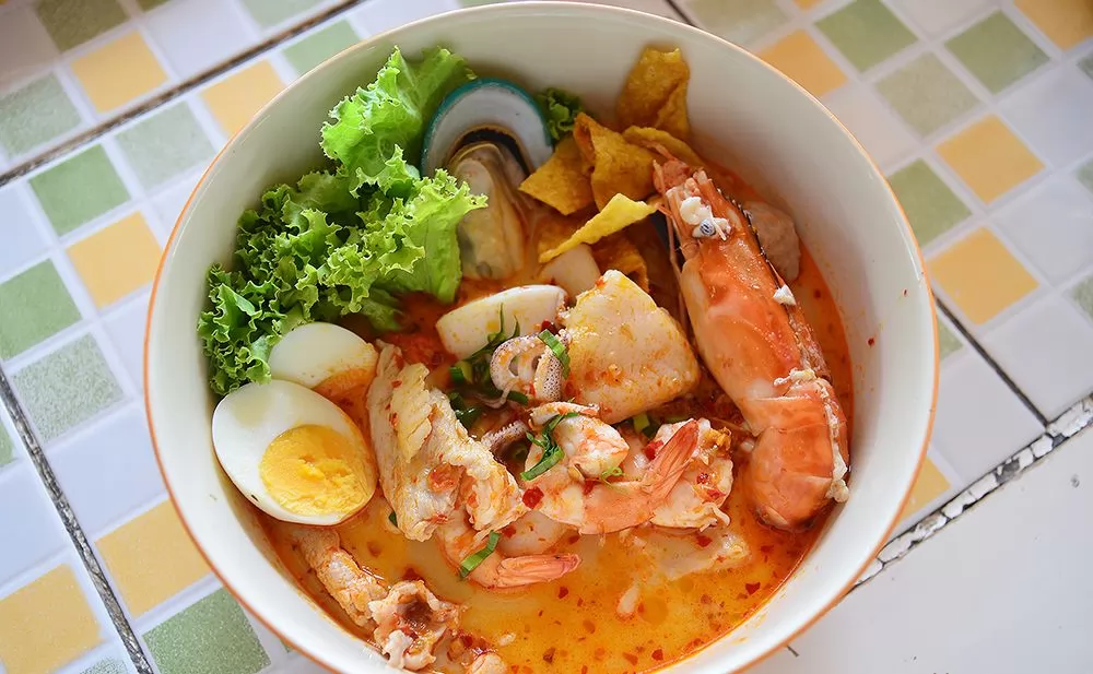 店開張後,主要的賣點就是「酸辣海鮮麵」,酸辣湯底,配料有1大隻蝦、魚肉、魷魚、蠔、豬肉、1顆水煮蛋、炸餃皮以及生菜等,加上麵或粿條,如此豐富的用料,1碗130銖,味道沒有太辣,食客們的「讚」聲不斷!
