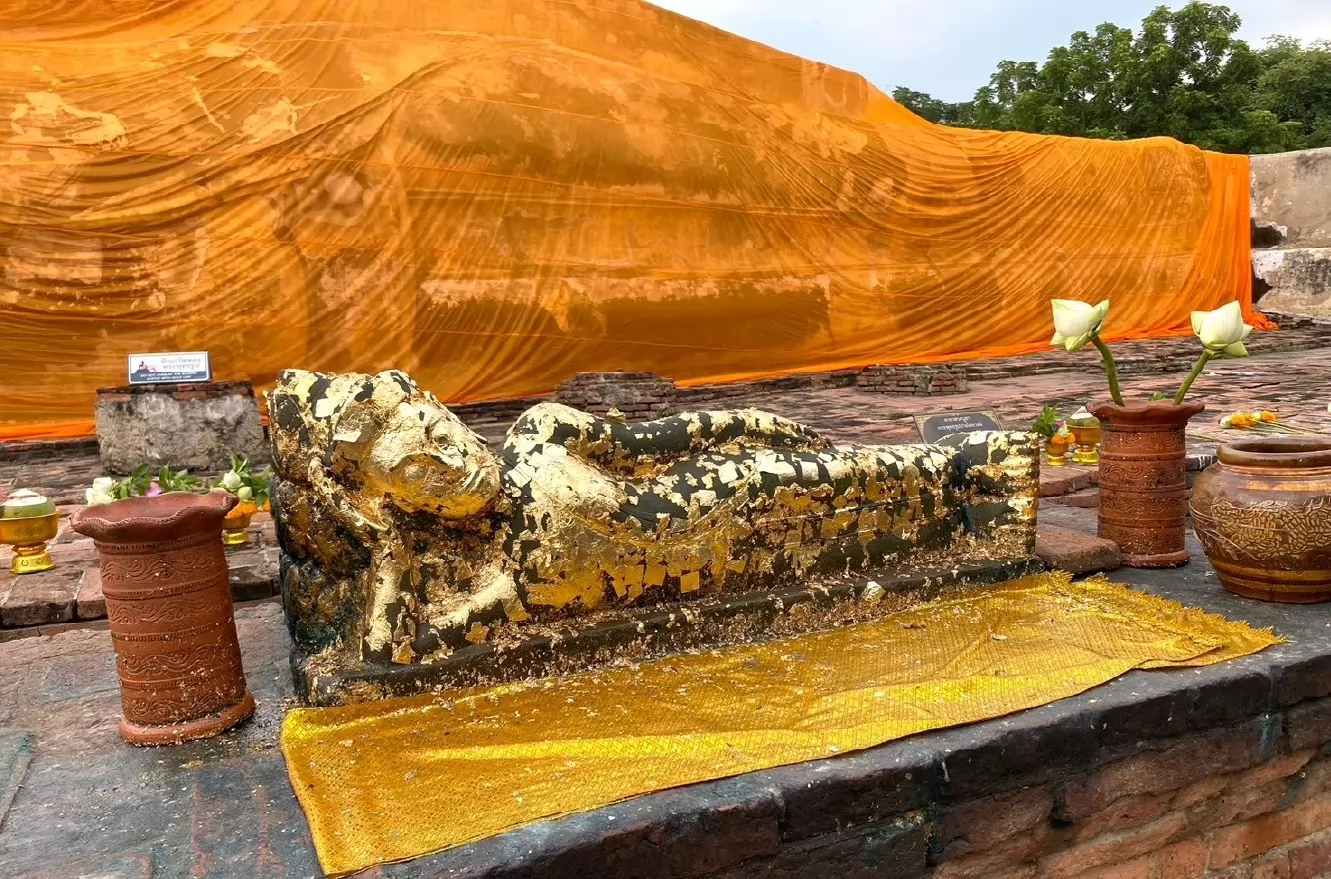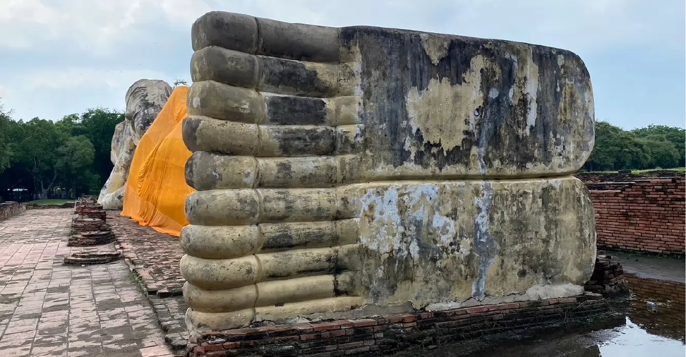 這尊臥佛長 42 公尺、高 8 公尺,是大城現存最大的1座臥佛,也比曼谷臥佛寺裡貼金的臥佛巨大。