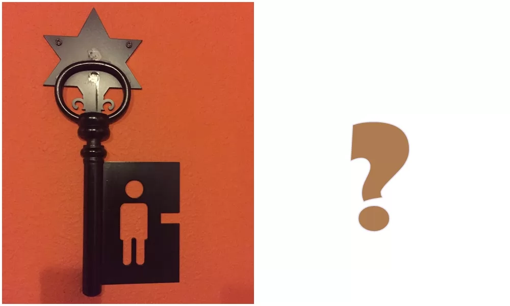 引人遐思—看到這樣的廁所標誌,你會如何解讀?看圖說故事是要男生偷看女生嗎?店家幽默的說,因為廁所只有1間,這標示是「男女共用」啦!