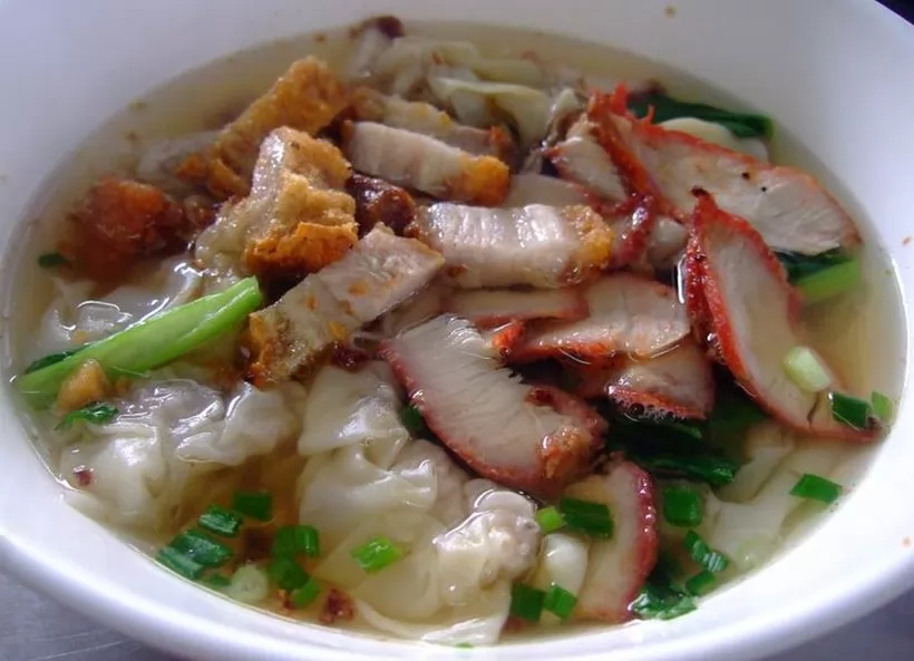 切片的紅燒豬肉、切長塊的脆皮燒豬肉,搭配餛飩,不論是湯或乾麵(1碗55銖),都讓象哥吃得津津有味,當然,若再加四大天王調味料,更是好!