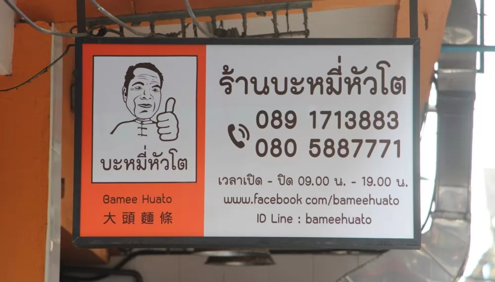 找到這家麵店,除了泰國媒體的介紹,另外就是象哥看到店家的招牌,感覺很親切,雖然說是大頭,可是招牌裡的老闆,頭卻很正常,豎起大姆指是對自製的「麵」很有信心,保證用好料、很好吃!不然老闆就頭大了。