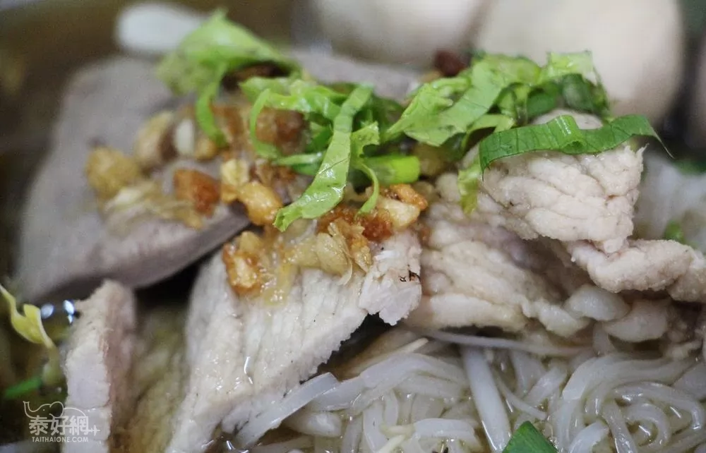 燉豬肉口味,有米粉、細河粉、寬粉可選,1碗40-50銖,有豬肉丸、豬肉片、豬肝、豆芽、蔥花、油炸蒜等,湯頭清淡可口。