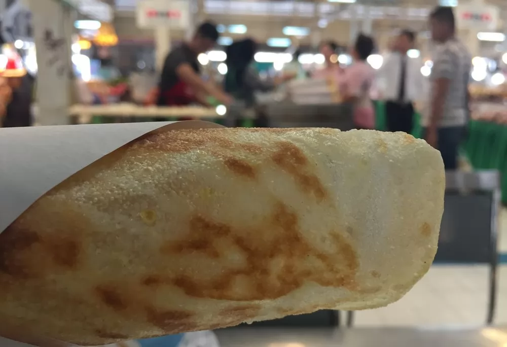 出地鐵面對市集東側美食區、靠近室外植被販賣區,有個專賣Roti和泰奶的小攤位,這家賣的Roti很特別,不同於一般煎成的圓形和方形,而是捲起來的長條形,不用再加少白糖、煉乳,直接吃,酥脆、香甜,超級好吃!