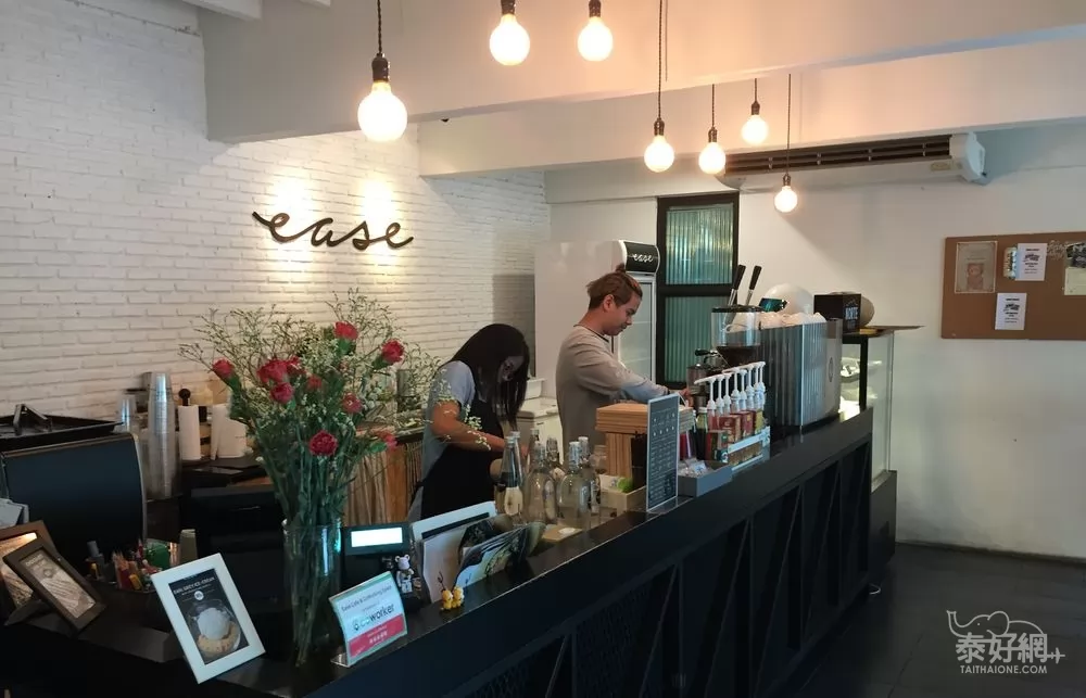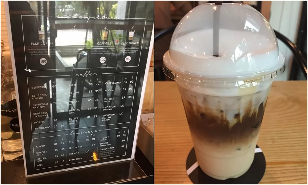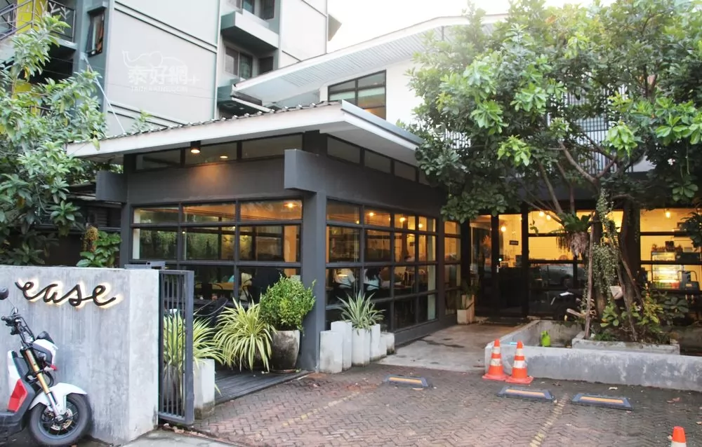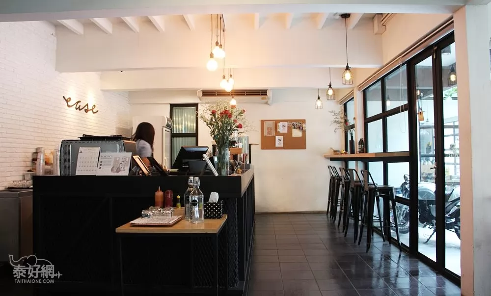 阿里巷有很多咖啡店,在這戰區裡,必須要有特色才能生存,Ease Café針對需要上網工作的族群,提供一般咖啡店都有的Espresso、Espresso Macchiato、 Americano、 Latte、 Caramel Latte、 Hazelnut Latte 、Mocha等,價格在60-105銖之間,熱拿鐵(80銖)、冰拿鐵(90銖),有冰水免費提供,得自助去倒。如果有吃點什麼,這裡有輕食和糕點。