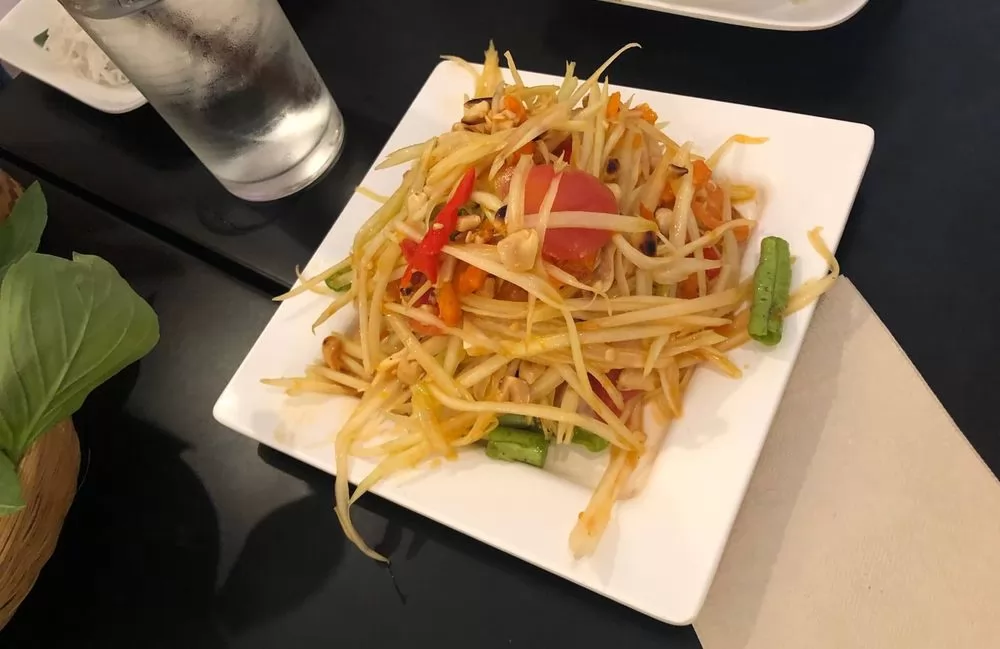 東北菜中少不了的就是涼拌青木瓜(宋丹),這裡有多種口味,不辣的泰式涼拌青木瓜(Tum Thai),1盤只要60銖,非常的便宜。