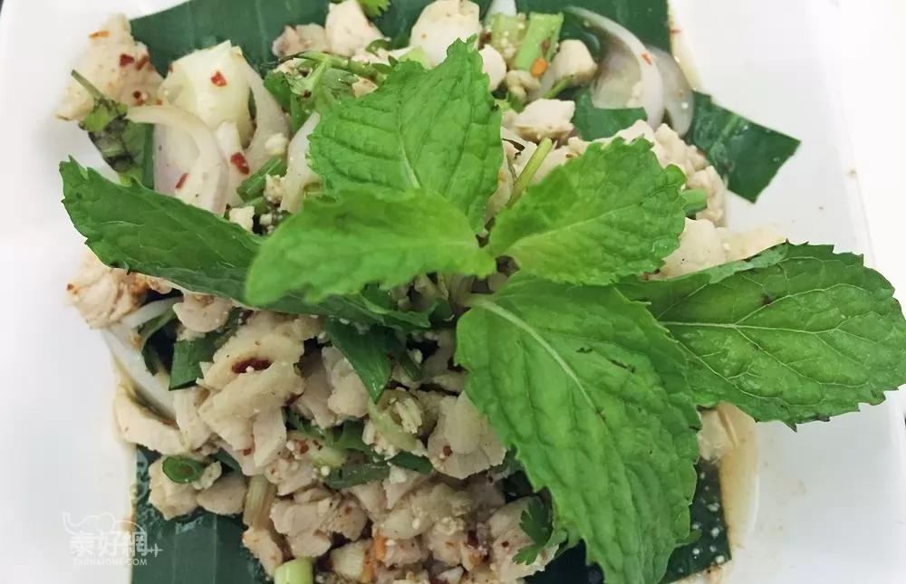 涼拌碎豬肉,東北的名菜,又酸又辣,搭配生菜一起吃,更過癮!1盤85銖。