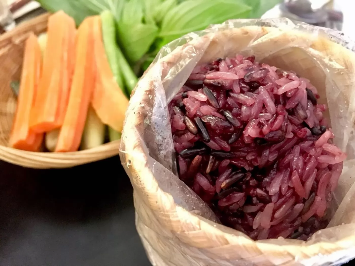 店裡有提供紫糯米,1盒20銖,還附贈幾片黃瓜和紅蘿蔔。