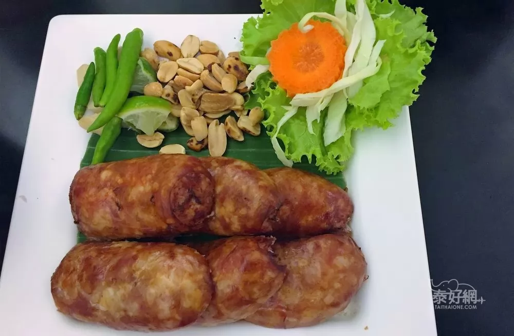 再是東北風味的香腸(Fried Isan Sausages),圓形香腸切半+烤花生+青辣椒和生菜,1盤90銖。吃之前,可以擠點檸檬汁在香腸上,口惑更佳。