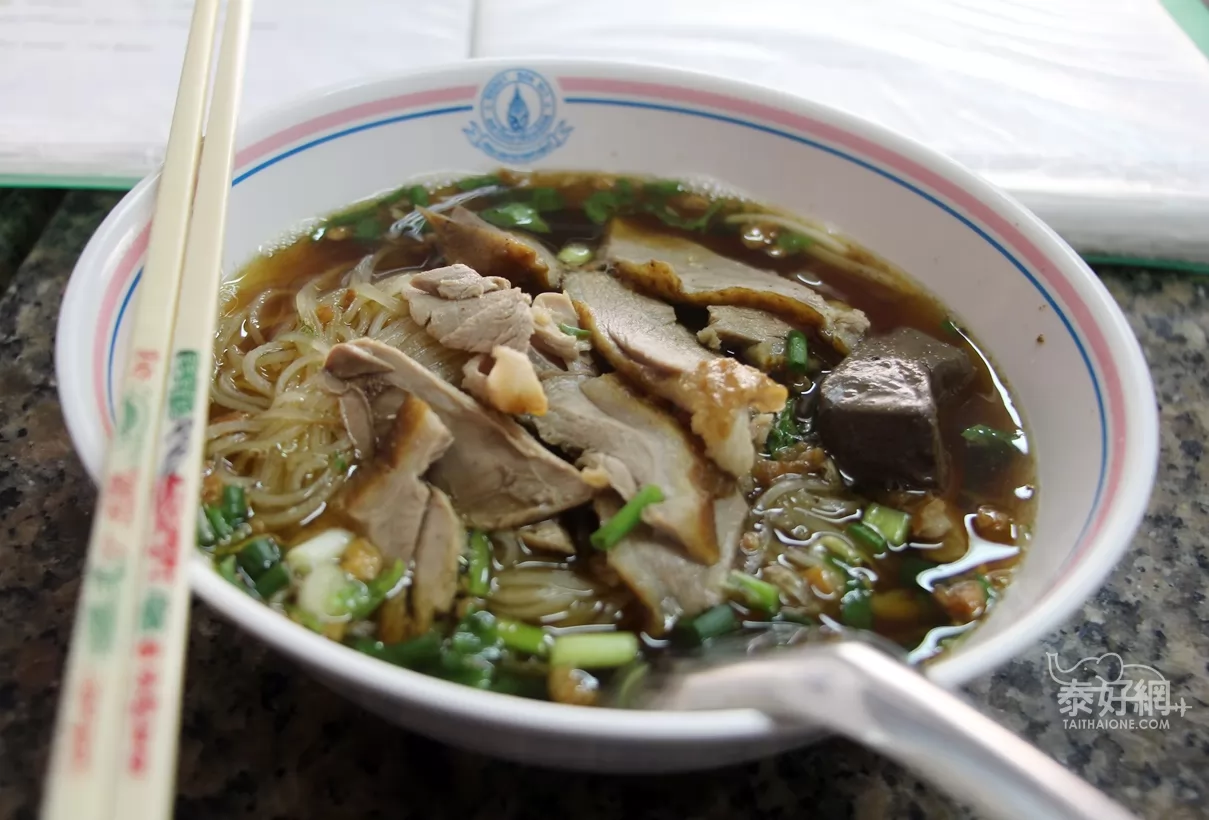 鴨肉粿條,內有鴨肉、鴨腎、鴨肝同鴨血,鴨肉滷得入味,湯頭好喝,鴨血也好吃,麵底可選米粉(เส้นหมี่)、粗粿條(เส้นใหญ่)、細粿條(เส้นเล็ก)及雞蛋麵(บะหมี่),1碗60銖,好吃沒話說,正常人可以填飽肚子。