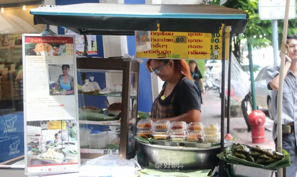 據說已賣了50年了,小吃攤能被美食媒體的報導,足以證明其美味,重點還在價格,1盒甜糯米飯,加了椰奶製成如布丁的配料,只要20銖,真的便宜又好吃!