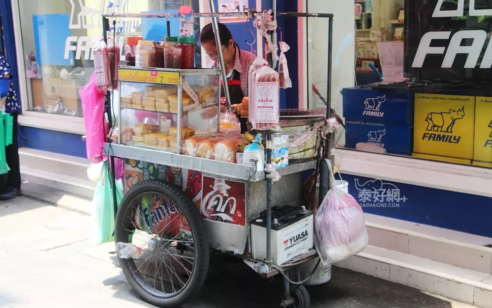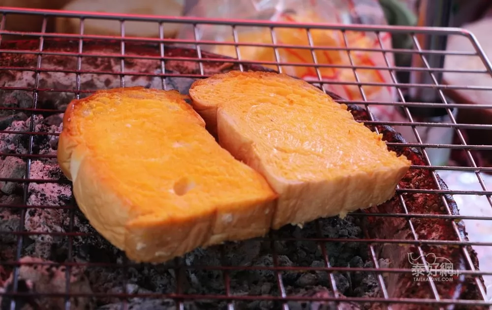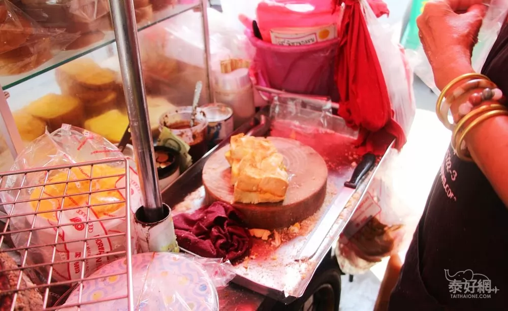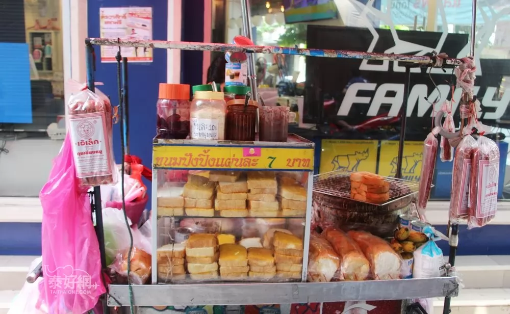 烤厚片吐司廣受當地人喜愛,當早餐或下午茶點,但是當大家的價位都調漲到1片10銖以上的時刻,這家賣了幾十年的小攤子的價格還停留在7銖。