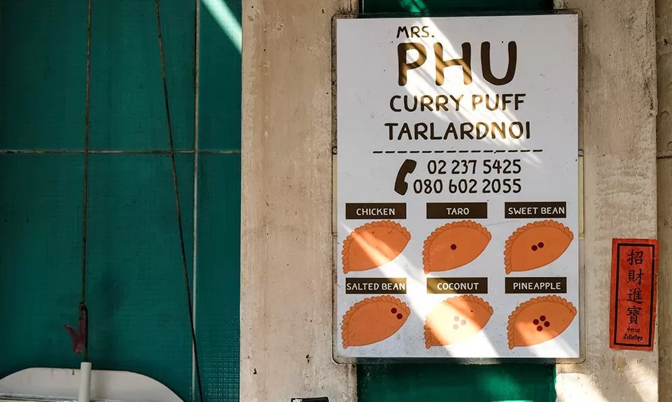 再往石龍軍路(เจริญกรุง 22).第22巷裡走,這裡有家Phu Curry Puff (ชิมของหวาน กระหรี่ปั๊บคุณปุ๊)專買炸咖哩餃子,是小市場裡的人氣排隊美食。