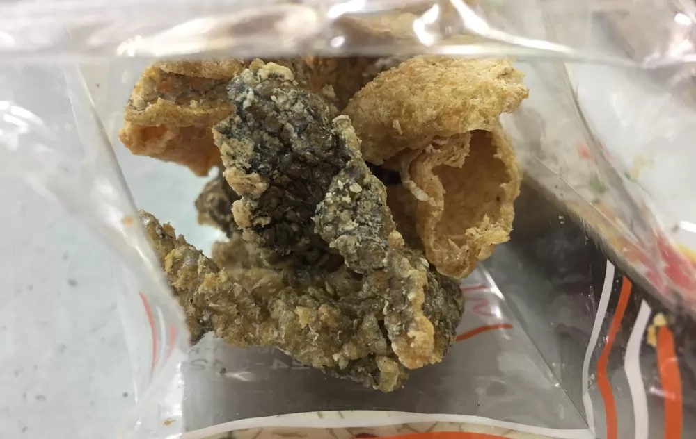 另外很特別的是「炸魚皮」,吃處吃不到的,這裡1包1包(20銖)的放在桌上,喜歡就可以打開來吃,空嘴吃會覺得鹹帶有一點腥味,最好是搭配麵底粿條來吃。