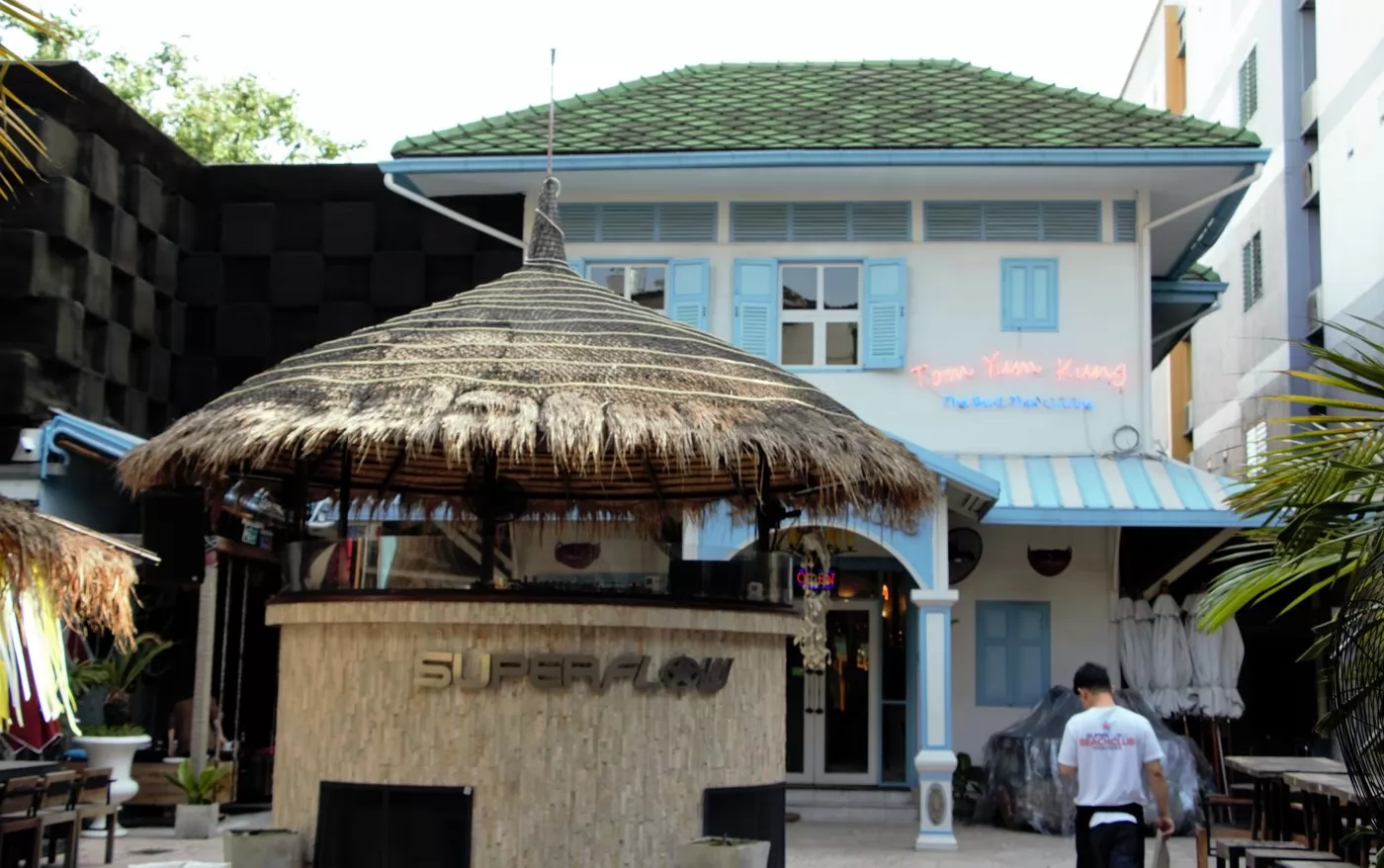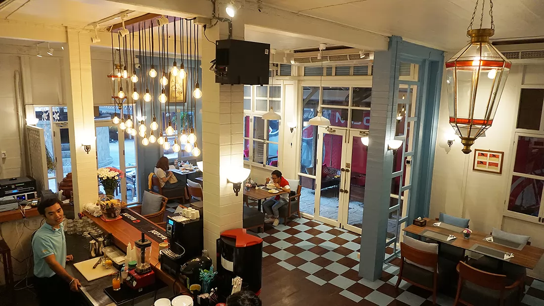 穿過騎樓走進窄巷,兩幢拉瑪六世時代留下來的白色木房,充滿泰國風味,90多年歷史,經過一番裝修,前園後庭以及全棟樓都是餐廳,環境十分悠閒。