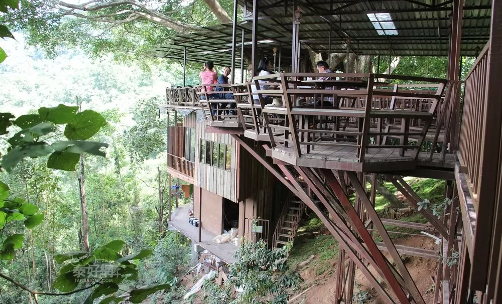 地點在清邁東面湄安(Mae On)縣內原始叢林中,從山上的停車場看去,已經感受到巨樹的宏偉壯觀,很夢幻吧?!兩邊有一左一右(左進加出)吊索木橋連接,咖啡店建在樹幹上的一個巨大平臺,座位設在四周,也有小吊椅。