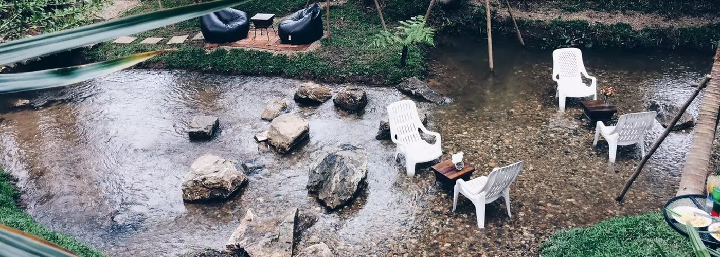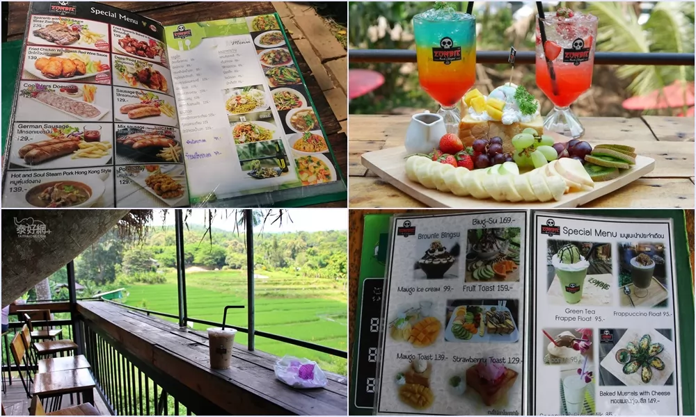 清邁湄林縣的Zombie Coffee(ชอมนี้ คาเฝ่),在小河道上擺起桌椅,讓客人拉起褲腿,坐在河裡,一邊浸腳,一邊用餐或喝著冰咖啡,很消暑!