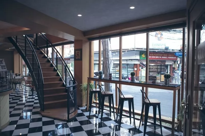 從地鐵站出來步行3分鐘,咖啡店與Amaranta Hotel連結,包含1、2樓,木材裝潢為主的嶄新店面,在周邊很顯目,走進去,黃色系的木板牆和屋頂、加上黑白方塊石磚,又是另一番不同的感受。