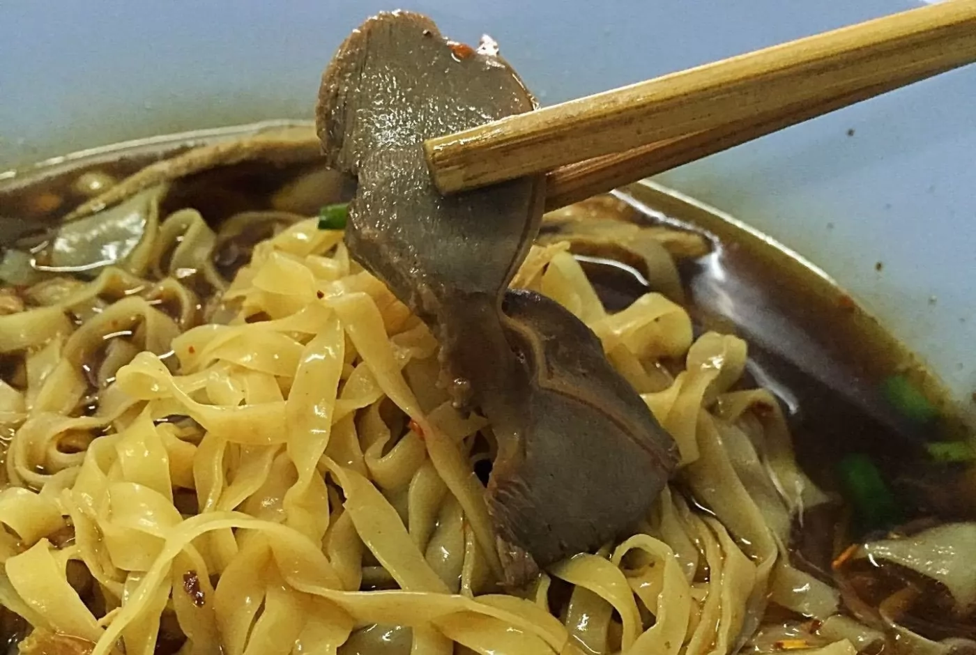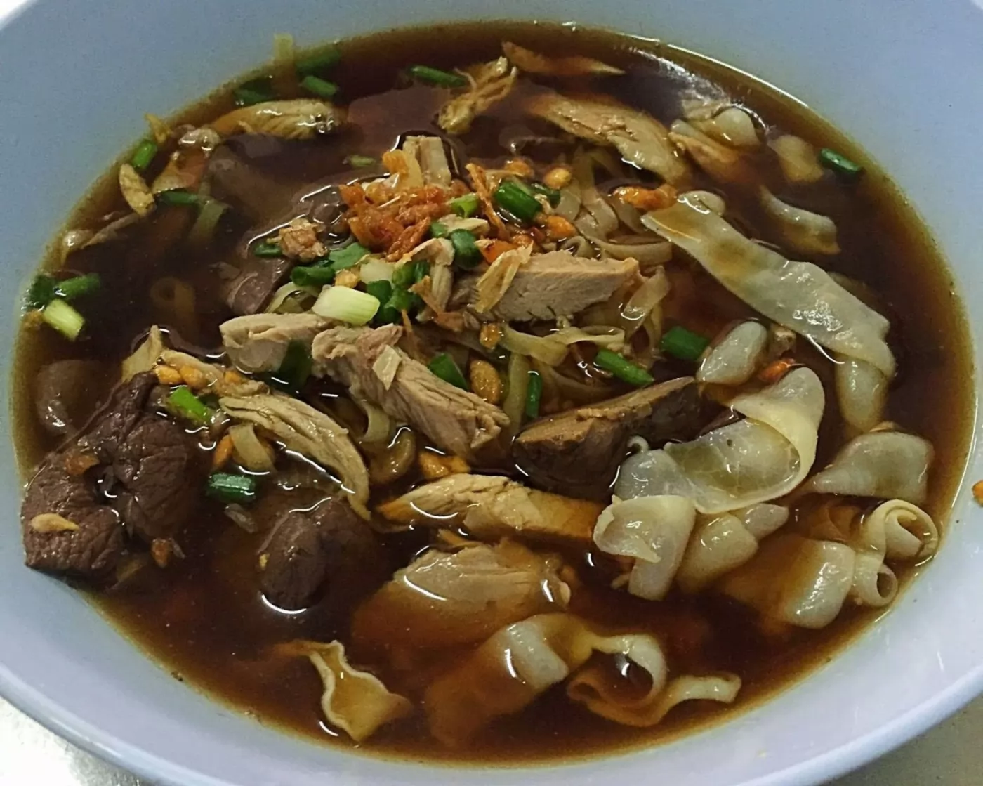 鴨肉按泰式的程序處理,加入中藥材調理,長期燉煮出正統的味道,火候掌握得剛好,肉質不會煮過頭的軟爛,超好吃!給的鴨肉料夠多,還有鴨血、肝、腸、豆芽等,撒上蔥花和炸蒜片,湯頭爽口帶些回甜,很配細粿條或寬麵條。