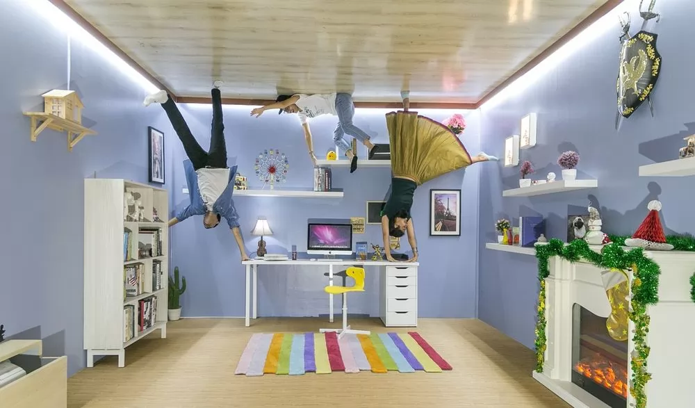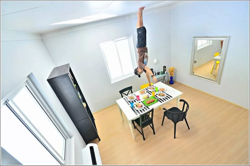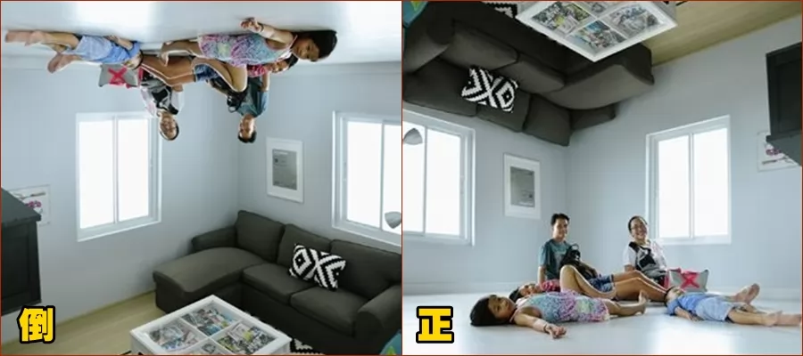 人走進去,屋內傢俱都是被懸掛在天花板,遊客站在屋內的「地板」拍照,不只是客廳,連洗手間內的馬桶、浴缸也是倒吊的方式,還有泰國的嘟嘟車也被倒吊在屋內,提供給客人拍照,再把照片上下顛倒過來,照片的人就像被「倒吊」在屋子天花板一樣,很搞怪!當然那只是假像,卻可以騙騙不知情的朋友。