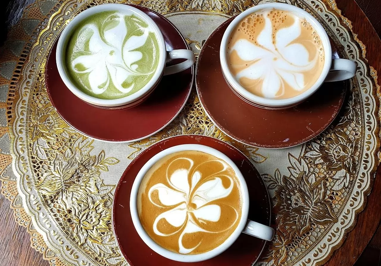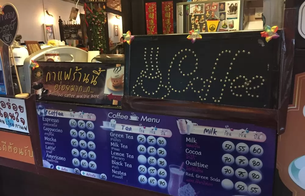 來到櫃檯前,有招牌用泰、英文寫著「這裡的咖啡很好喝!」,咖啡的種類盲在下方,價格從60到95銖,另有茶和牛奶等飲品,價格從60到80銖。