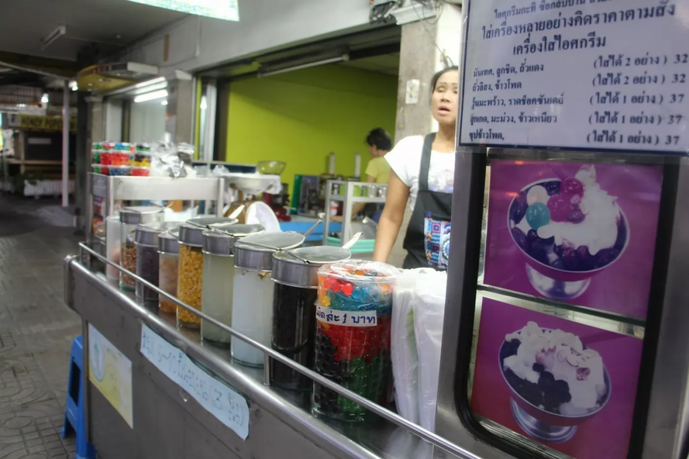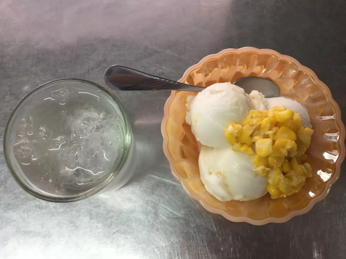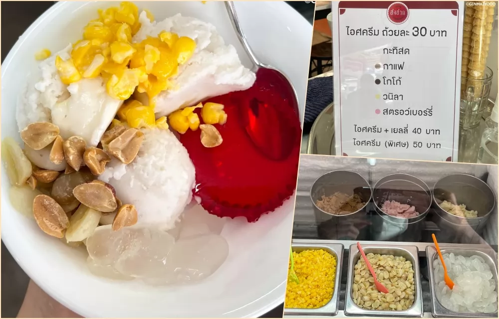 3球冰淇淋,可加1樣配料,玉米、花生、果凍等,才20銖(2022年漲到30銖),超便宜!而且店家還貼心的附上1杯冰水。如果嫌不夠,可以點特級(1份40銖,2022年漲到50銖)。