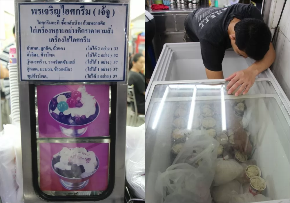 一般來吃的客人會先點「招牌冰」,兩球冰淇淋加1樣配料(糯米飯、玉米、紅豆等)和1杯冰水,50銖有找!然後再買盒裝冰淇淋帶走。