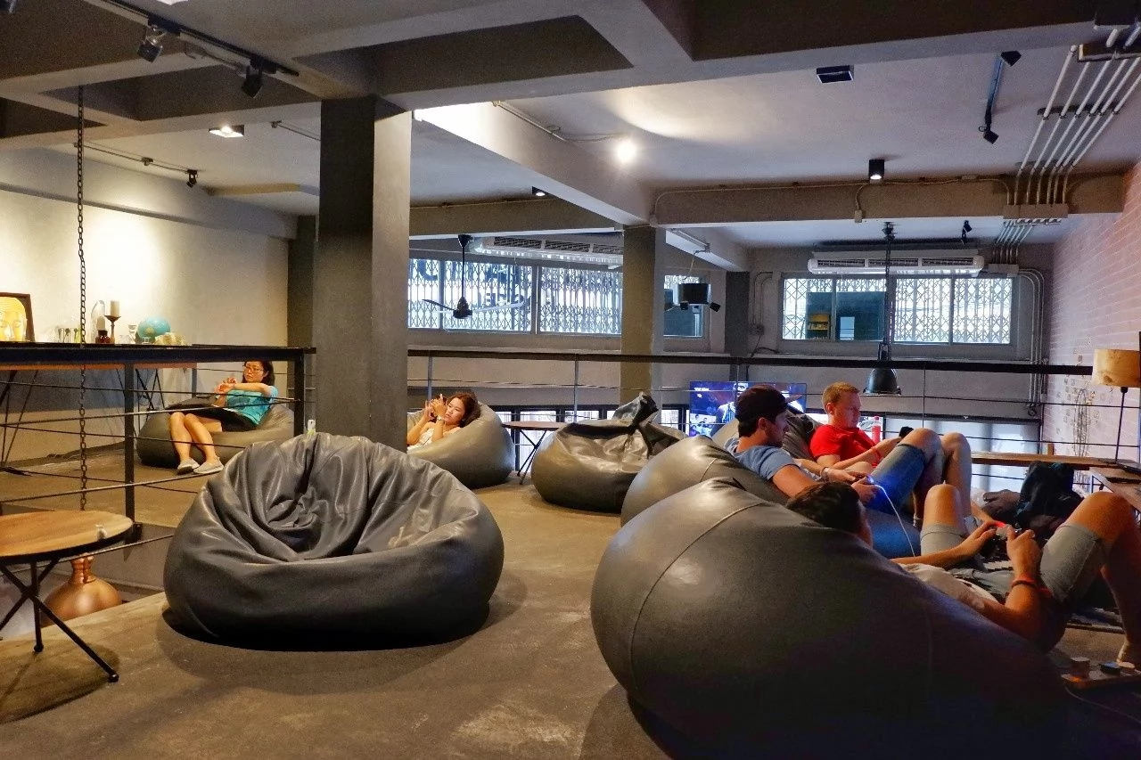 上層是有大電視台和電腦,以及大圓的懶人包沙發組合成的休閒交誼區,讓人感覺回到了家,溫暖和舒適的氣氛,吸引很多歐美的客人入住。