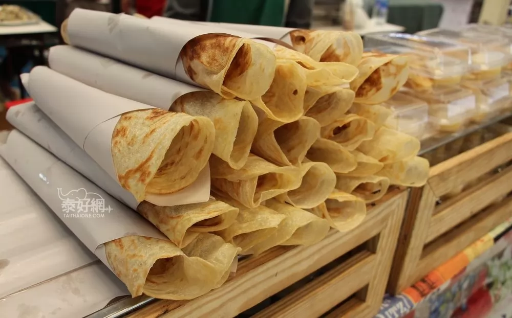 在飲食區的旁邊有個專賣Roti和泰奶的小攤位,這家賣的Roti很特別,不同於一般煎成的圓形和方形,而是捲起來的長條形,不用再加白糖、煉乳,直接吃,酥脆、香甜,超級好吃!1個35銖,吃起來很方便,不用擔心會黏手。