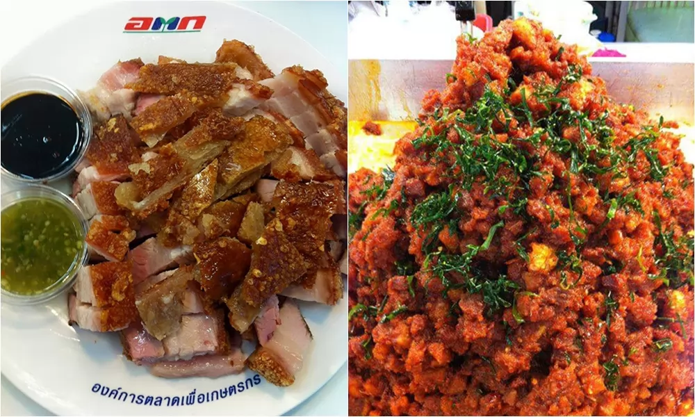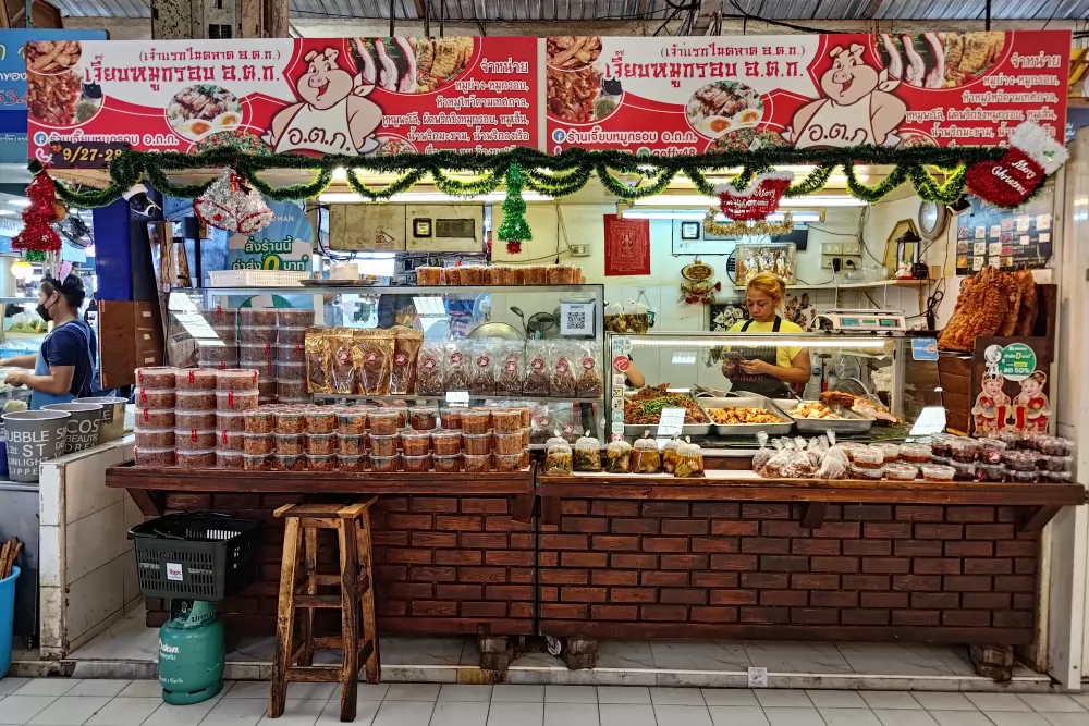 市場裡這家脆皮烤豬肉(ร้านเจี๊ยบหมูกรอบ อ.ต.ก.)也是人氣店,烤出高品質的脆皮豬肉,香味四溢,皮脆、肉嫩加上肥油,組合出來的美味,一吃起來就讓人忍不住一口接一口,提供兩種不同的沾醬,廣獲客人的肯定。