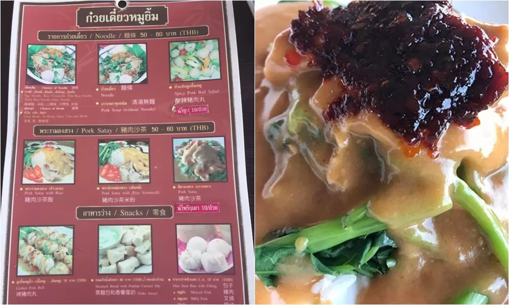 有提供飯、麵(50-60銖);豬肉沙茶飯(50-60銖);以及小吃,肉丸、吐司蘸醬、包子(豬肉、叉燒、奶油、黑豆沙)等,包子1個15銖。