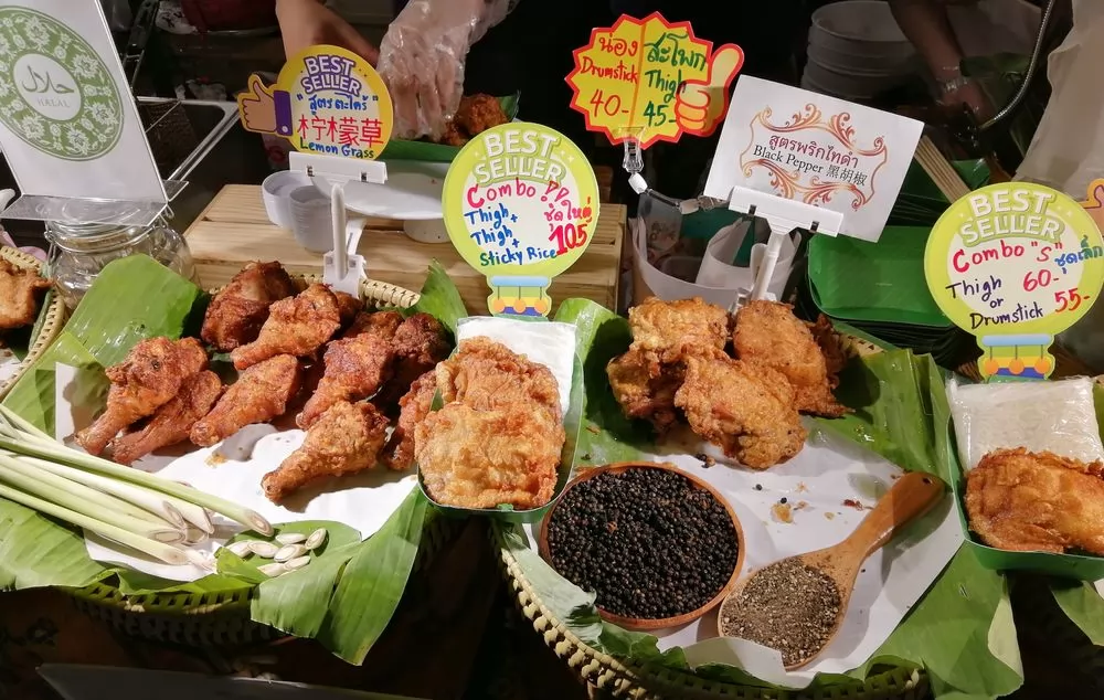 當然也不少了在地美食、水果等。這家炸雞攤值得推薦,檸檬草炸雞配糯米飯非常「泰味」,檸檬草的酸,讓肉質變得柔軟,外表脆皮炸的稍幹,但卻更顯酥脆。